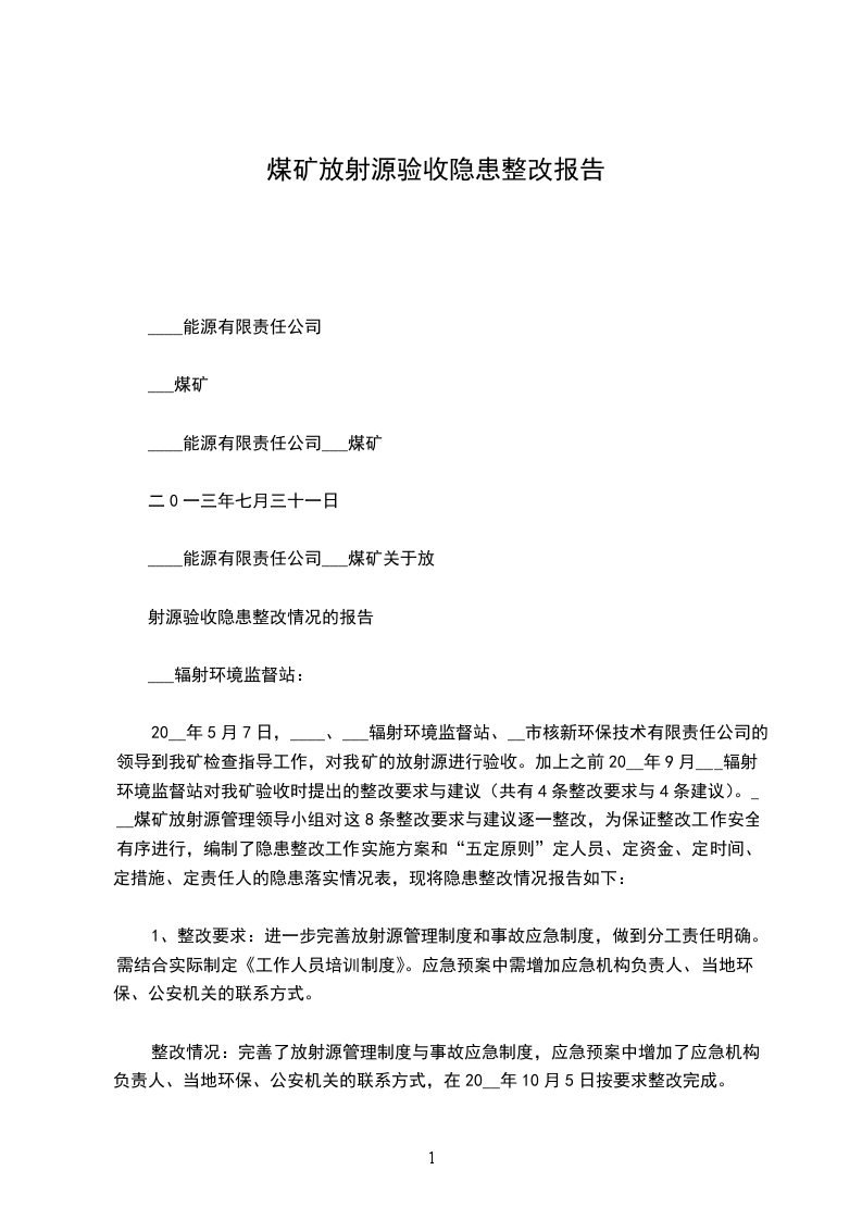 20__年5月7日,____、___辐射环境监督站、__市核新环保技术有限责任公司的领导到我矿检查指导工作,对我矿的放射源进行验收。加上之前20__年9月___辐射环境监督站对我矿验收时提出的整改要求与建议(共有4条整改要求与4条建议)。___煤矿放射源管理领导小组对这8条整改要求与建议逐一整改,为保证整改工作安全有序进行,编制了隐患整改工作实施方案和“五定原则”定人员、定资金、定时间、定措施、定责任人的隐患落实情况表,现将隐患整改情况报告如下:
