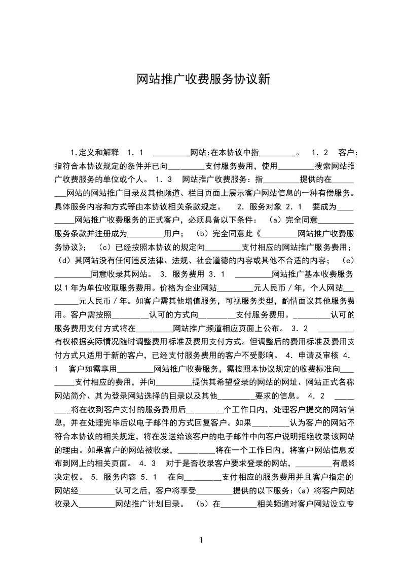 1.定义和解释 1.1 _________网站:在本协议中指_________。 1.2 客户:指符合本协议规定的条件并已向_________支付服务费用,使用_________搜索网站推广收费服务的单位或个人。 1.3 网站推广收费服务:指_________提供的在_________网站的网站推广目录及其他频道、栏目页面上展示客户网站信息的一种有偿服务。具体服务内容和方式等由本协议相关条款规定。 2.服务对象 2.1 要成为_________网站推广收费服务的正式客户,必须具备以下条件: (a)完全同意_________服务条款并注册成为_________用户; (b)完全同意此《_________网站推广收费服务协议》; (c)已经按照本协议的规定向_________支付相应的网站推广服务费用; (d)其网站没有任何违反法律、法规、社会道德的内容或其他不合适的内容; (e)_________同意收录其网站。 3.服务费用 3.1 _________网站推广基本收费服务以1年为单位收取服务费用。价格为企业网站_________元人民币/年,个人网站_________元人民币/年。如客户需其他增值服务,可视服务类型,酌情面议其他服务费用。客户需按照_________认可的方式向_________支付服务费用。_________认可的服务费用支付方式将在_________网站推广频道相应页面上公布。 3.2 _________有权根据实际情况随时调整费用标准及费用支付方式。但调整后的费用标准及费用支付方式只适用于新的客户,已经支付服务费用的客户不受影响。 4.申请及审核 4.1 客户如需享用_________网站推广收费服务,需按照本协议规定的收费标准向_________支付相应的费用,并向_________提供其希望登录的网站的网址、网站正式名称、网站简介、其为登录网站选择的目录以及其他_________要求的信息。 4.2 _________将在收到客户支付的服务费用后_________个工作日内,处理客户提交的网站信息,并在处理完毕后以电子邮件的方式回复客户。如果_________认为客户的网站不符合本协议的相关规定,将在发送给该客户的电子邮件中向客户说明拒绝收录该网站的理由。如果客户的网站被收录,_________将在一个工作日内,将客户网站信息发布到网上的相关页面。 4.3 对于是否收录客户要求登录的网站,_________有最终决定权。 5.服务内容 5.1 在向_________支付相应的服务费用并且客户指定的网站经_________认可之后,客户将享受_________提供的以下服务:(a)将客户网站收录入_________网站推广计划目录。 (b)在_________相关频道对客户网站设立专门页面,进行操作性强、关注度高,具有新闻品质的推介。 (c)根据客户需求,在_________网站推广范围内,为客户建立相互间的通联。 (d)根据客户需求,在_________网站推广范围内,为相关客户进行牵线搭桥等信息服务。 (e)根据客户需求,在传统媒体、网络媒体为客户网站进行操作性强、关注度,具备新闻品质的同步互同式推介。 6.服务开通及终止 6.1 客户同意在提交网站登陆申请后选择付款方式,并及时支付服务费用。支付该服务费用的行为并不保证客户的网站一定会被_________网站推广收录。如果客户的网站不符合本协议相关条款的规定,_________将退还该客户已经支付的服务费用(不包括利息)。 6.2 _________将于收到客户全额支付的服务费用之日起依据本协议的规定提供各项服务。如果_________在客户提交登录请求的14个工作日后仍未收到客户支付的服务费用,_________有权删除该客户登录的网站信息,对因此产生的一切后果,_________不承担任何责任。 7.客户的权利义务 7.1 客户向_________支付服务费用后,可按照本协议的规定享受相应的服务。 7.2 客户必须保证其登录的网站不能含有任何违反国家有关法律、法规及中华人民共和国承认或加入的国际条约的内容,包括但不限于危害国家安全、淫秽色情、虚假、违法、诽谤(包括商业诽谤)、非法恐吓或非法骚扰、侵犯他人版权、人身权或其他合法权益或利益以及有违公序良俗的内容。 7.3 客户必须保证其提交的信息真实、准确、及时、详尽和完整并与其要求登录的网站当前情况一致。 7.4 客户的网站必须有一定有益的实质内容,此项标准由_________全权决定。 7.5 客户的同一网站不能重复登陆。 7.6 客户的网站必须能够支持多种浏览器,并且每天24小时正常运行、能被访问。 7.7 客户在使用_________提供的_________网站推广服务时必须保证: (a)遵守中国有关法律法规的规定。 (b)不利用网站推广服务进行任何非法活动。 (c)不干扰网站推广服务的正常进行。 (d)遵守所有与使用网站推广服务有关的网络协议、规定、程序和惯例。 7.8 客户通过_________网站推广收费服务进行商务活动所引起的经济纠纷与_________无关。 7.9 如客户违反本协议规定的任何义务,给_________造成损失,客户必须负责相应的赔偿。 8._________的权利义务 8.1 _________有义务按照本协议的规定为客户提供_________网站推广收费服务。如_________违反本协议规定的任何义务,给客户造成损失,_________应负责相应的赔偿。 8.2 _________有权在_________的服务器上保存所有客户的信息(包括但不限于客户的登录信息)。 8.3 _________网站推广不收录含有色情等不良内容的广告(包括弹出窗口)或链接的提供主页空间的网站以及此类主页空间下的网站。 8.4 _________有权使用客户在申请登录或修改网站信息过程中提供的联系方式与客户联系有关_________网站推广收费服务的事宜。 8.5 _________不向其他任何第三方保证和承诺客户登录的网站符合登录标准。客