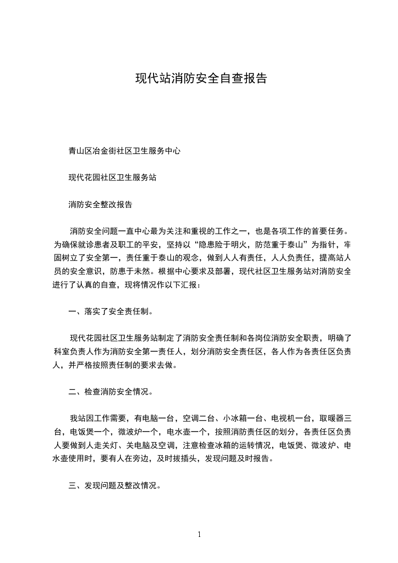 消防安全问题一直中心最为关注和重视的工作之一,也是各项工作的首要任务。为确保就诊患者及职工的平安,坚持以“隐患险于明火,防范重于泰山”为指针,牢固树立了安全第一,责任重于泰山的观念,做到人人有责任,人人负责任,提高站人员的安全意识,防患于未然。根据中心要求及部署,现代社区卫生服务站对消防安全进行了认真的自查,现将情况作以下汇报: