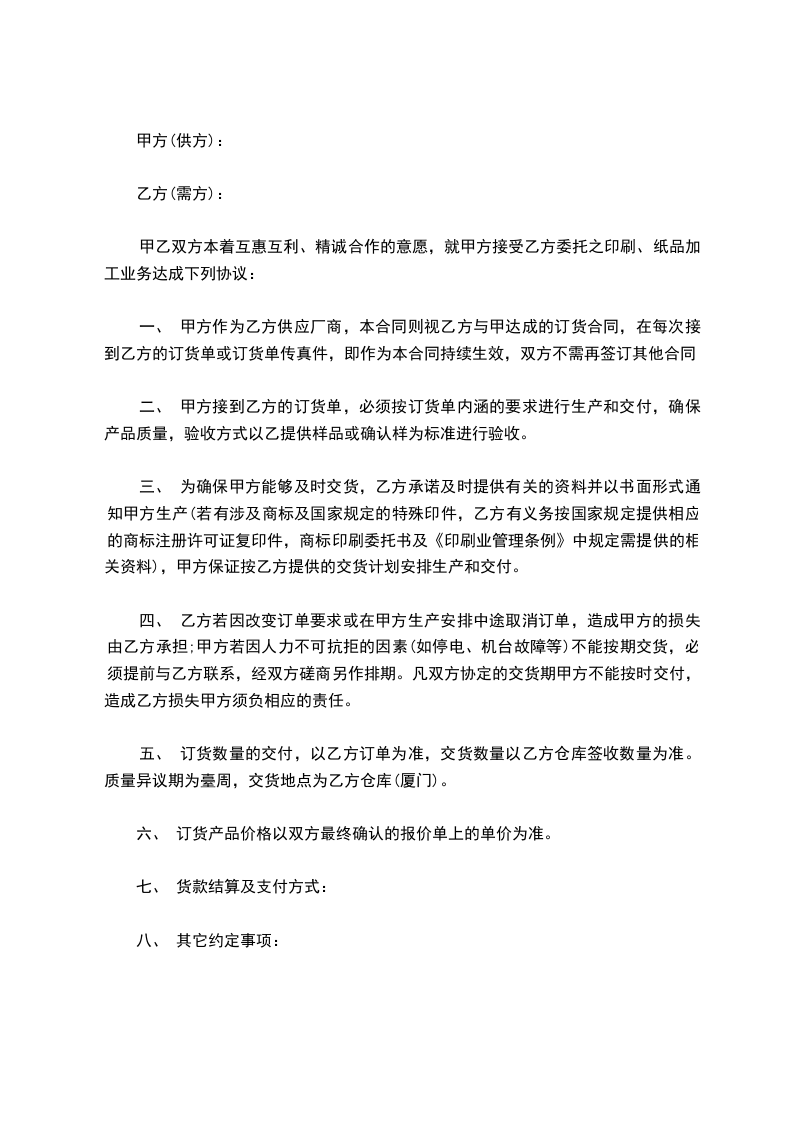 甲乙双方本着互惠互利、精诚合作的意愿,就甲方接受乙方委托之印刷、纸品加工业务达成下列协议: