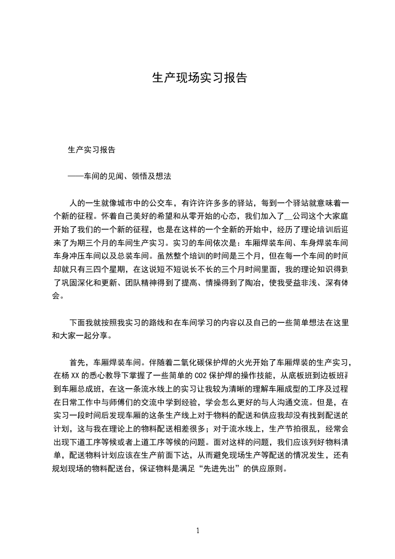 人的一生就像城市中的公交车,有许许许多多的驿站,每到一个驿站就意味着一个新的征程。怀着自己美好的希望和从零开始的心态,我们加入了__公司这个大家庭,开始了我们的一个新的征程,也是在这样的一个全新的开始中,经历了理论培训后迎来了为期三个月的车间生产实习。实习的车间依次是:车厢焊装车间、车身焊装车间、车身冲压车间以及总装车间。虽然整个培训的时间是三个月,但在每一个车间的时间却就只有三四个星期,在这说短不短说长不长的三个月时间里面,我的理论知识得到了巩固深化和更新、团队精神得到了提高、情操得到了陶冶,使我受益非浅、深有体会。