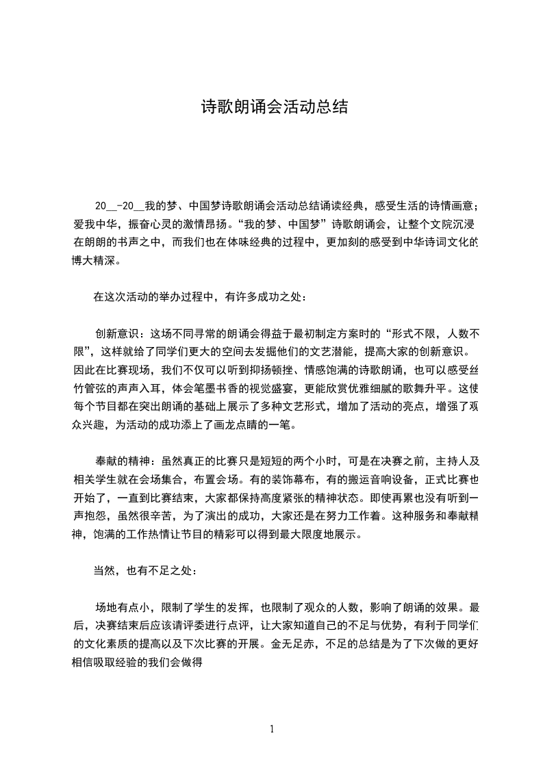20__-20__我的梦、中国梦诗歌朗诵会活动总结诵读经典,感受生活的诗情画意;爱我中华,振奋心灵的激情昂扬。“我的梦、中国梦”诗歌朗诵会,让整个文院沉浸在朗朗的书声之中,而我们也在体味经典的过程中,更加刻的感受到中华诗词文化的博大精深。