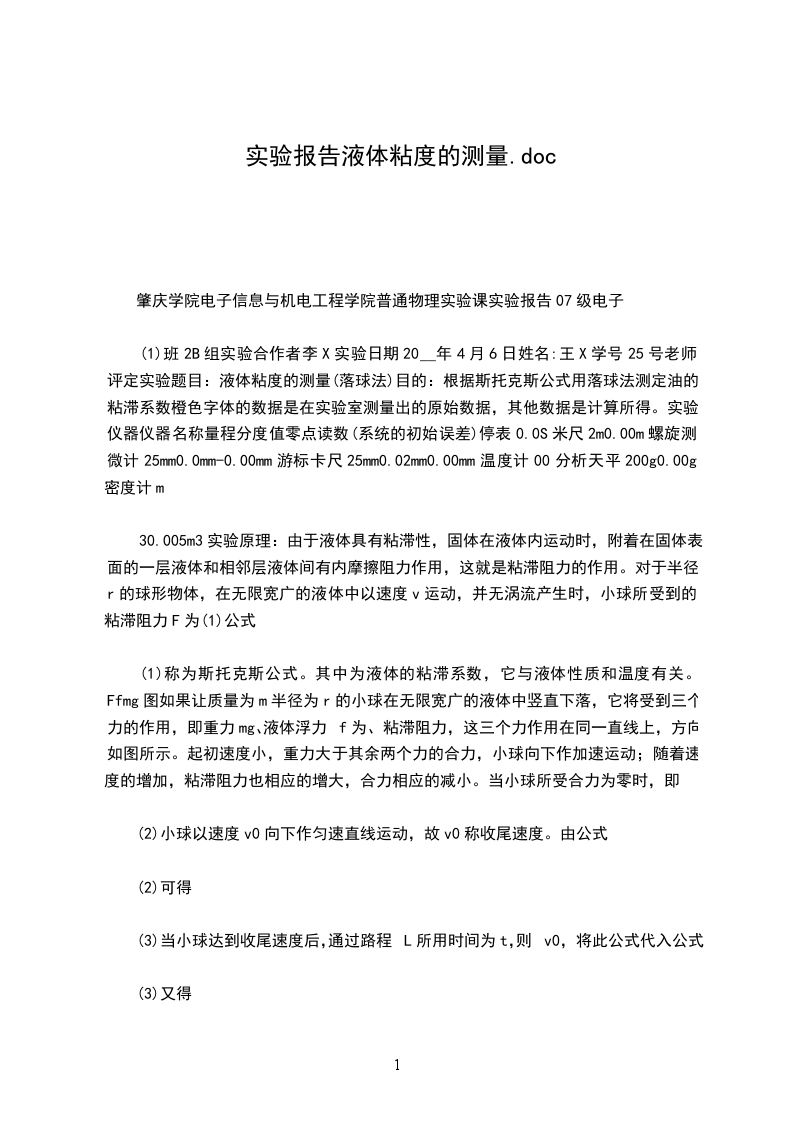 以上三项成绩不足30分者,表示实验过程没有完成,应重新预约该实验。实验完成后,学生课后完成一份完整的实验报告。四、数据记录及处理(35分)
