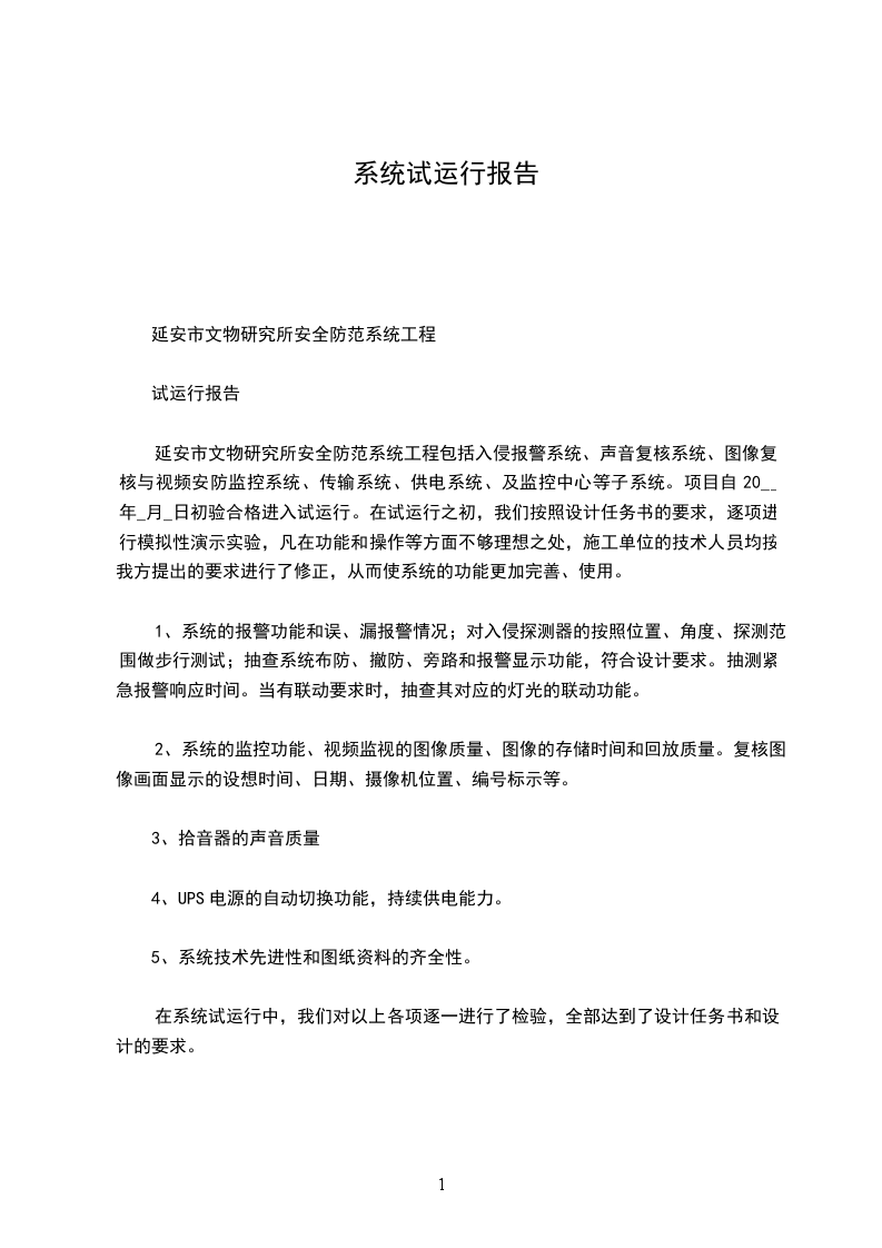 延安市文物研究所安全防范系统工程包括入侵报警系统、声音复核系统、图像复核与视频安防监控系统、传输系统、供电系统、及监控中心等子系统。项目自20__年_月_日初验合格进入试运行。在试运行之初,我们按照设计任务书的要求,逐项进行模拟性演示实验,凡在功能和操作等方面不够理想之处,施工单位的技术人员均按我方提出的要求进行了修正,从而使系统的功能更加完善、使用。