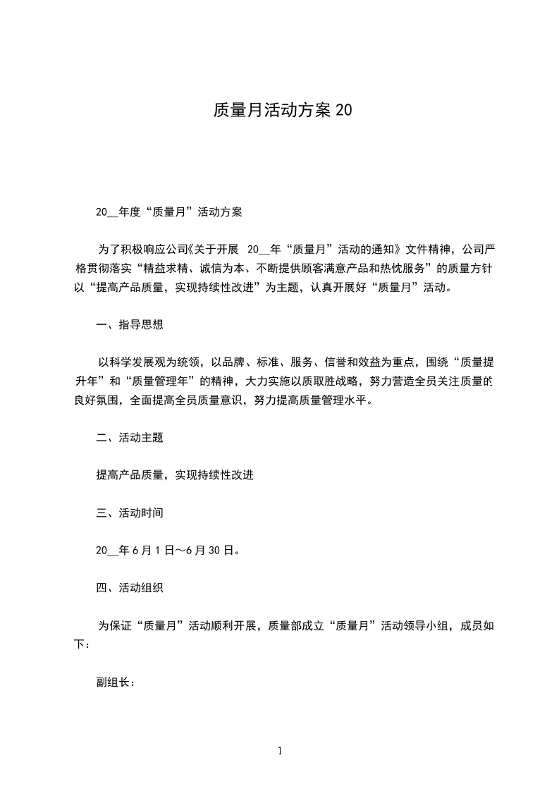 为了积极响应公司《关于开展20__年“质量月”活动的通知》文件精神,公司严格贯彻落实“精益求精、诚信为本、不断提供顾客满意产品和热忱服务”的质量方针,以“提高产品质量,实现持续性改进”为主题,认真开展好“质量月”活动。