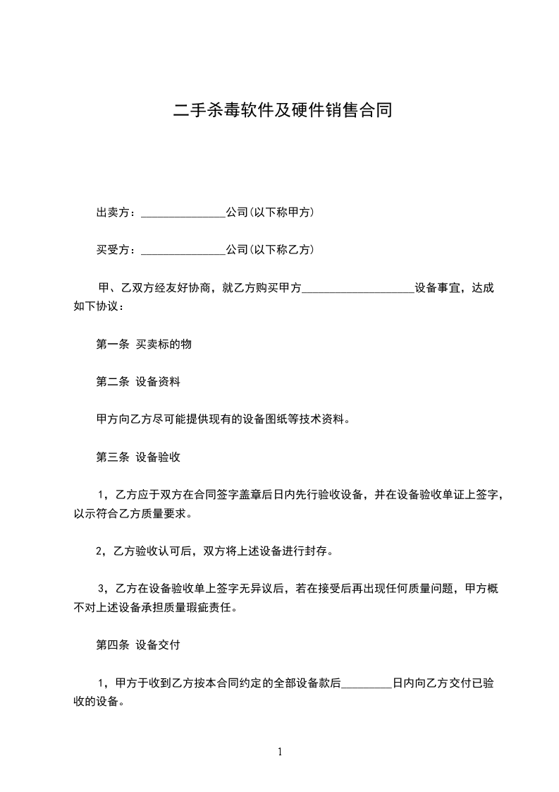 二手杀毒软件及硬件销售合同