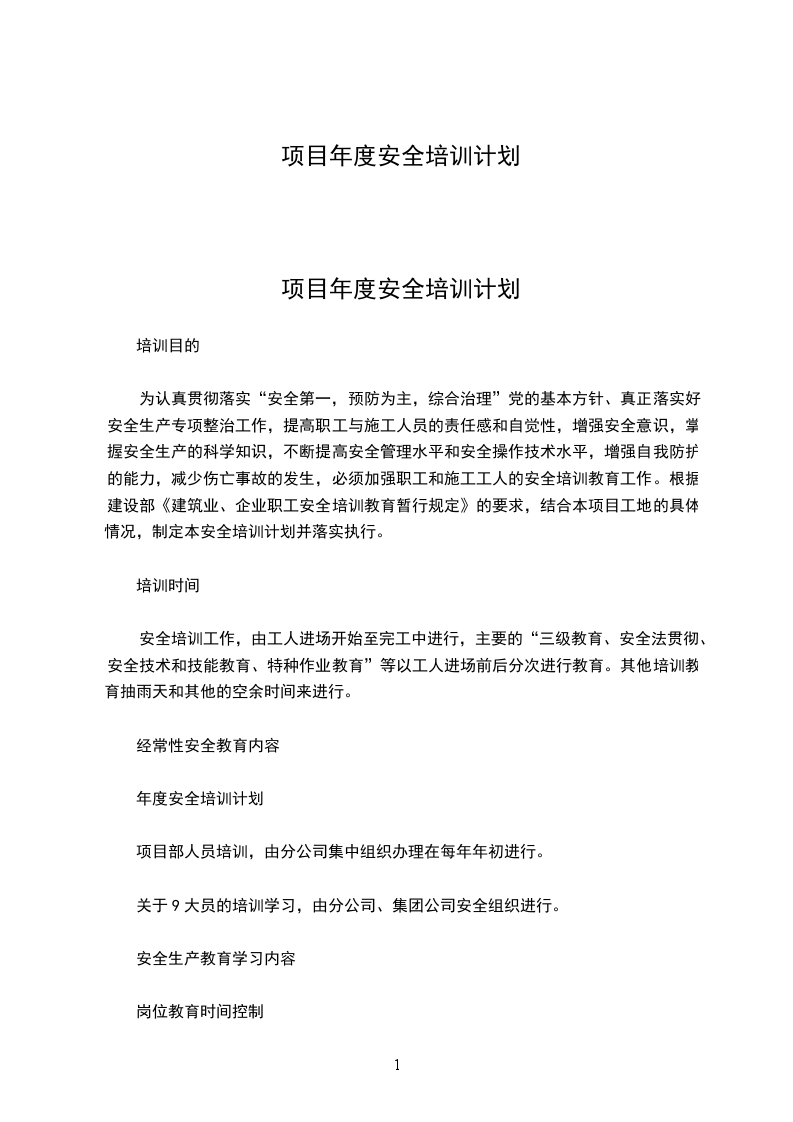 为认真贯彻落实“安全第一,预防为主,综合治理”党的基本方针、真正落实好安全生产专项整治工作,提高职工与施工人员的责任感和自觉性,增强安全意识,掌握安全生产的科学知识,不断提高安全管理水平和安全操作技术水平,增强自我防护的能力,减少伤亡事故的发生,必须加强职工和施工工人的安全培训教育工作。根据建设部《建筑业、企业职工安全培训教育暂行规定》的要求,结合本项目工地的具体情况,制定本安全培训计划并落实执行。