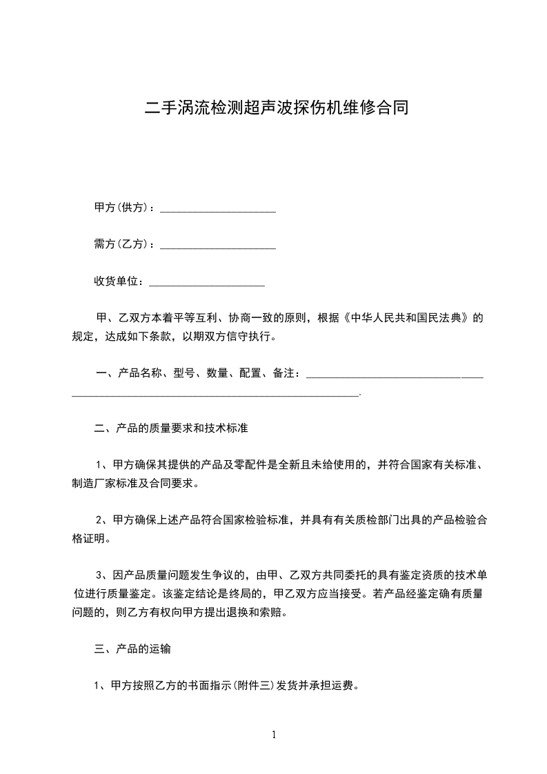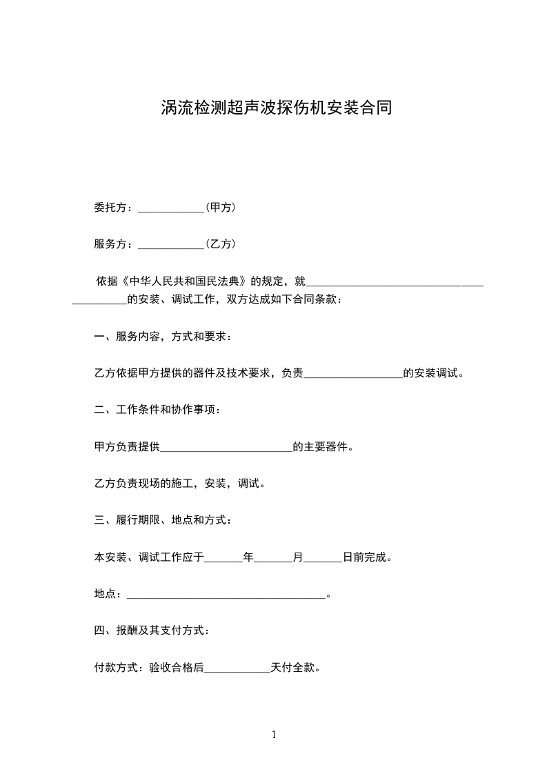 2.付款方式全部设备验收合格后的_______日内,甲方向乙方支付合同总金额的即元人民币整。若延期付款,甲方每天应向乙方缴纳延期额的千分之一作为罚金。合同总金额的余款即元人民币作为质保金,若设备运行正常,质保金在验收完成一年后的七日内一次性无息给付。