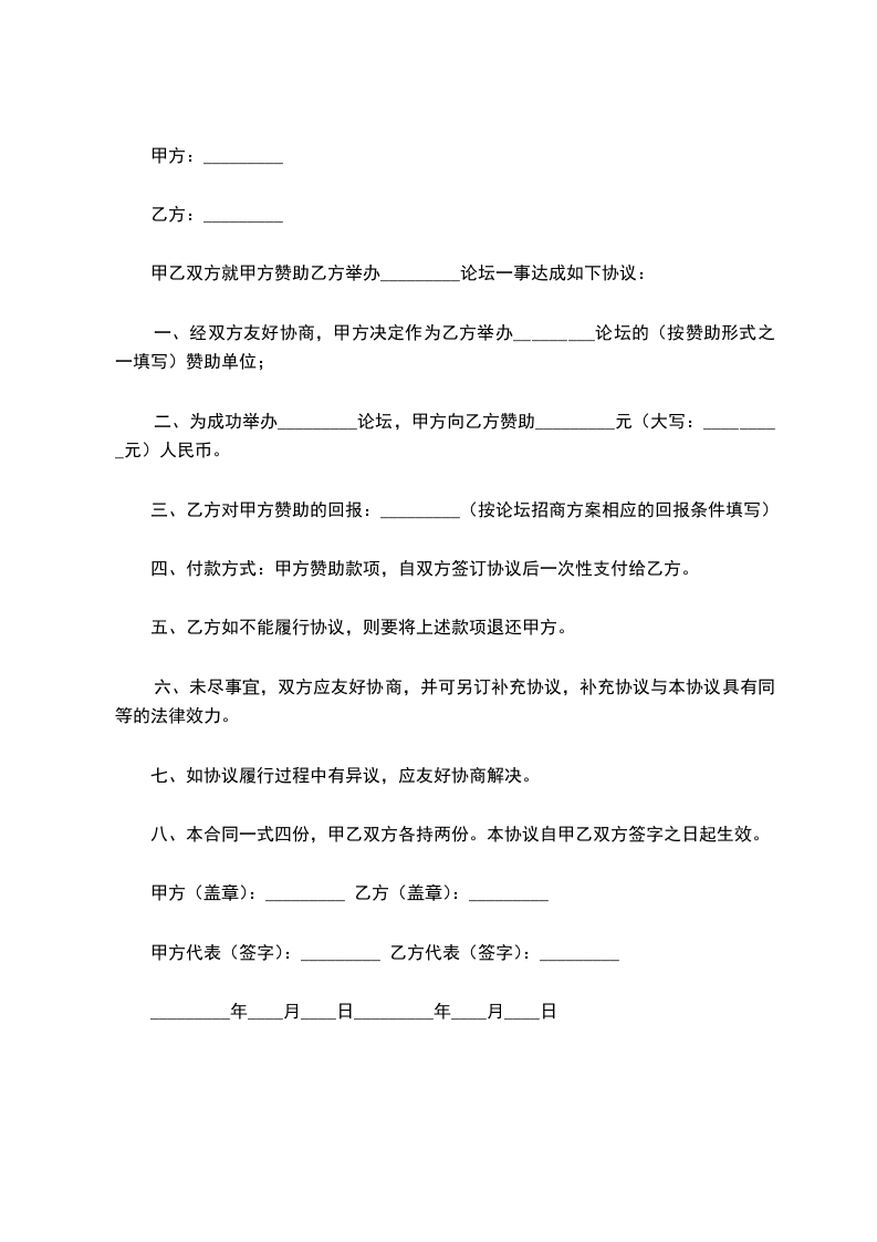 二、为成功举办_________论坛,甲方向乙方赞助_________元(大写:_________元)人民币。