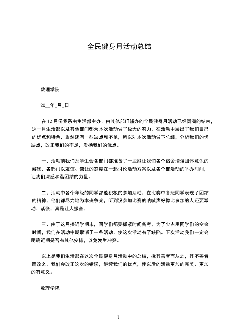 在12月份我系由生活部主办、由其他部门辅办的全民健身月活动已经圆满的结束,这一月生活部以及其他部门都为本次活动做了极大的努力,在活动中展出了我们自己的优点和特色,当然还有一些缺点和不足,所以对本次活动做下总结,分析我们的优缺点,改正我们的不足,发扬我们的优点。