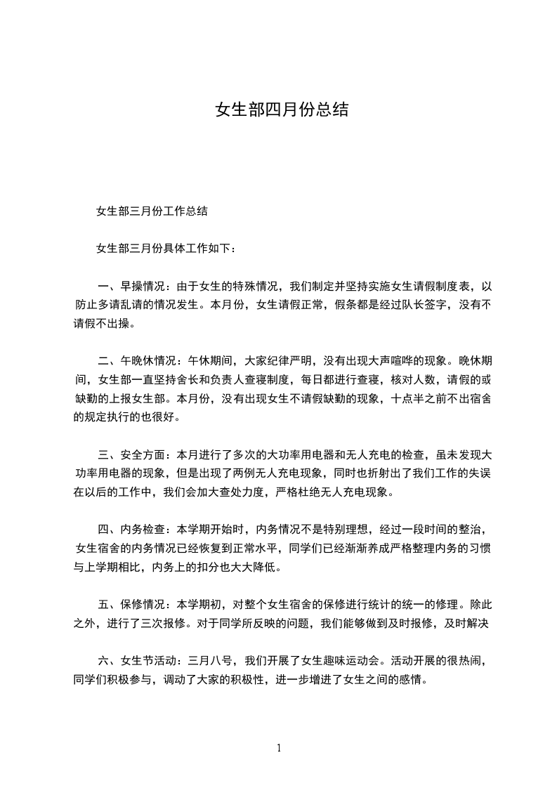 女生部三月份工作总结
