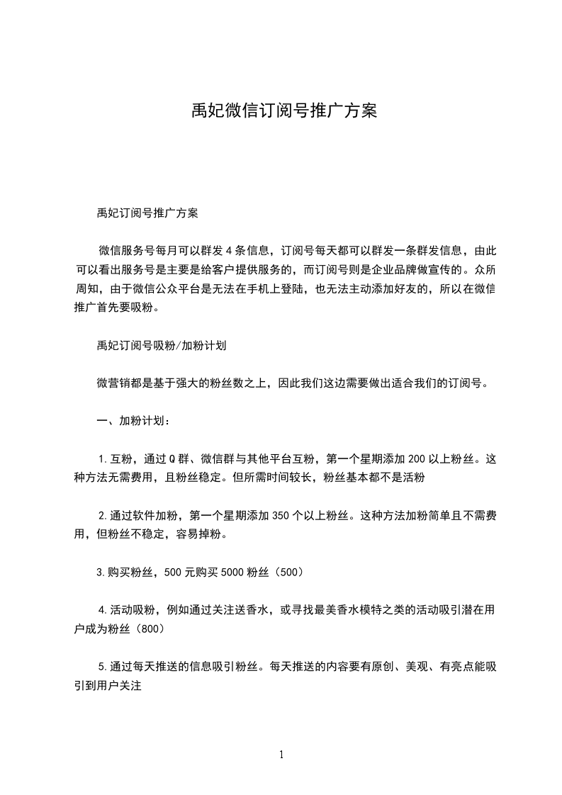 计划微信订阅号推送信息计划如下:1.每天推送文章规划:每天推送3-4篇文章,第一篇为活动/公司新闻动态/产品/当下热门话题,第二篇可以是公司产品介绍/或是原料解密,第三篇是行业咨询或是香水资讯,在香水资讯中插入禹妃产品软管,第四篇是励志/幽默的文章