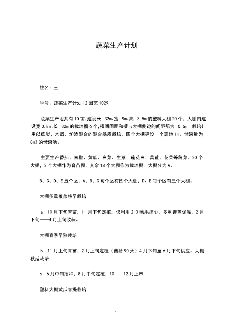 学号:蔬菜生产计划12园艺1029