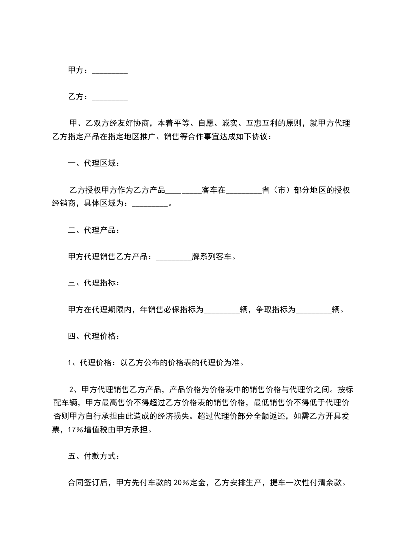 2、甲方代理销售乙方产品,产品价格为价格表中的销售价格与代理价之间。按标配车辆,甲方最高售价不得超过乙方价格表的销售价格,最低销售价不得低于代理价,否则甲方自行承担由此造成的经济损失。超过代理价部分全额返还,如需乙方开具发票,17%增值税由甲方承担。