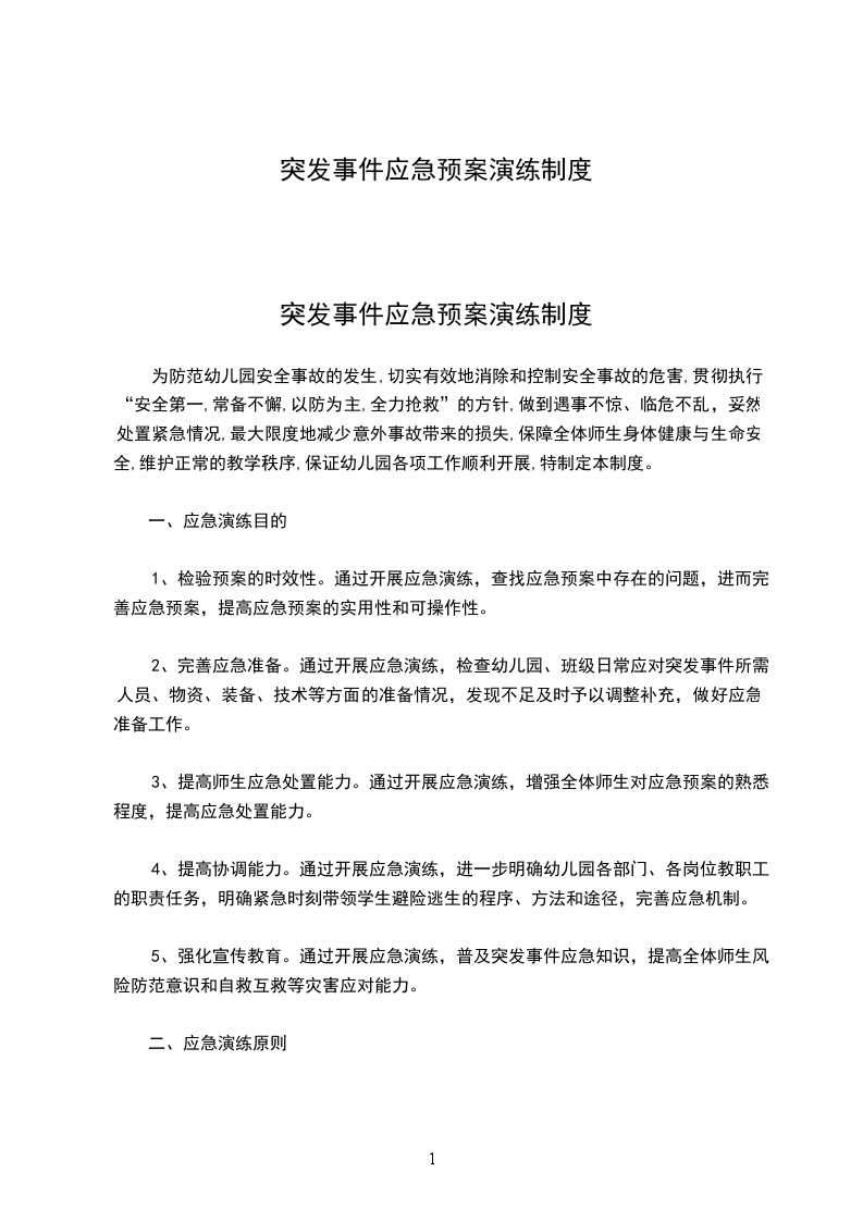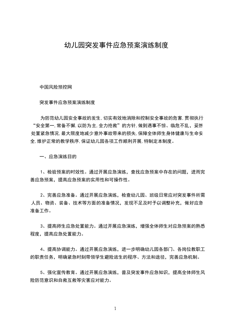 为防范幼儿园安全事故的发生,切实有效地消除和控制安全事故的危害,贯彻执行“安全第一,常备不懈,以防为主,全力抢救”的方针,做到遇事不惊、临危不乱,妥然处置紧急情况,最大限度地减少意外事故带来的损失,保障全体师生身体健康与生命安全,维护正常的教学秩序,保证幼儿园各项工作顺利开展,特制定本制度。