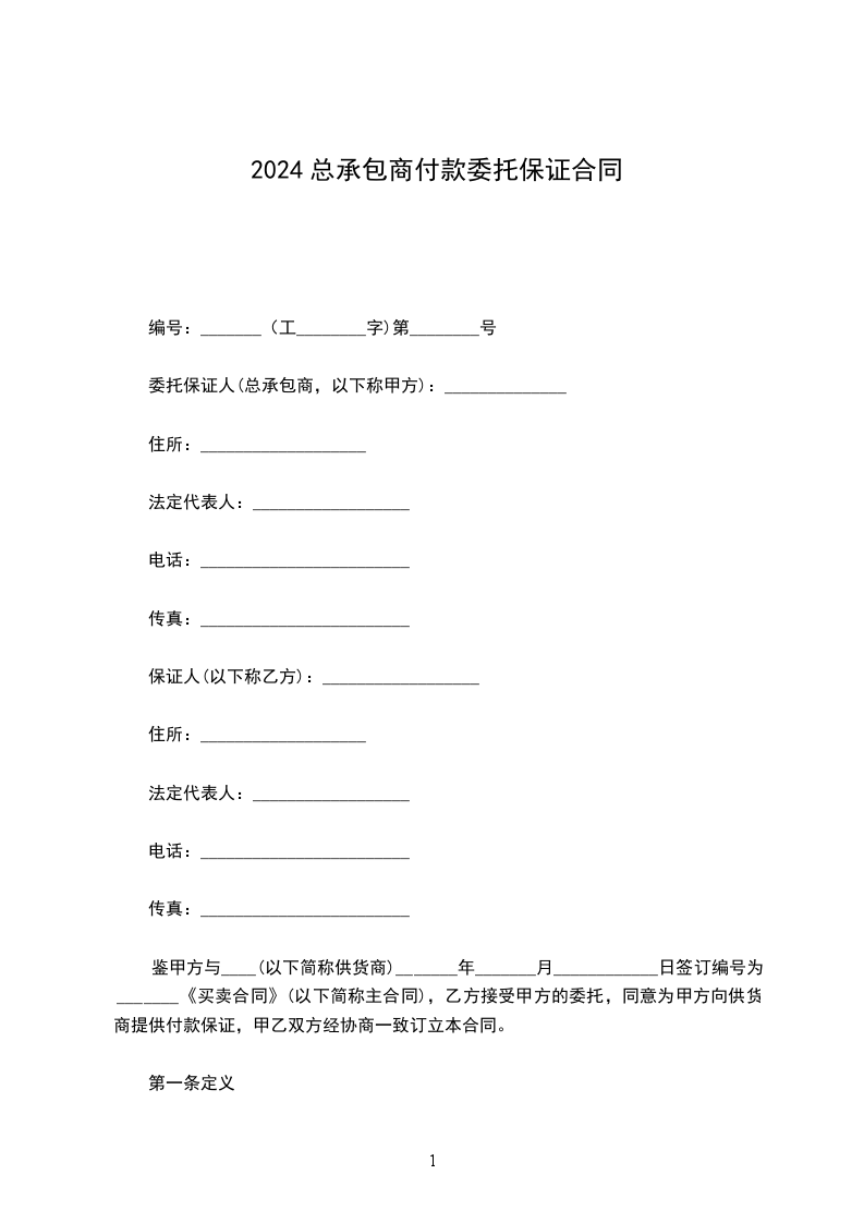 鉴于甲方与_________(以下简称分包商)就_________项目于_________年_________月_________日签订编号为_________号《分包合同》(以下简称主合同),乙方接受甲方的委托,同意以保证方式为甲方向分包商提供付款保证。甲乙双方经协商一致,订立本合同。