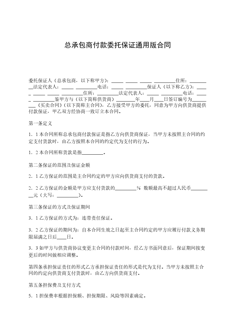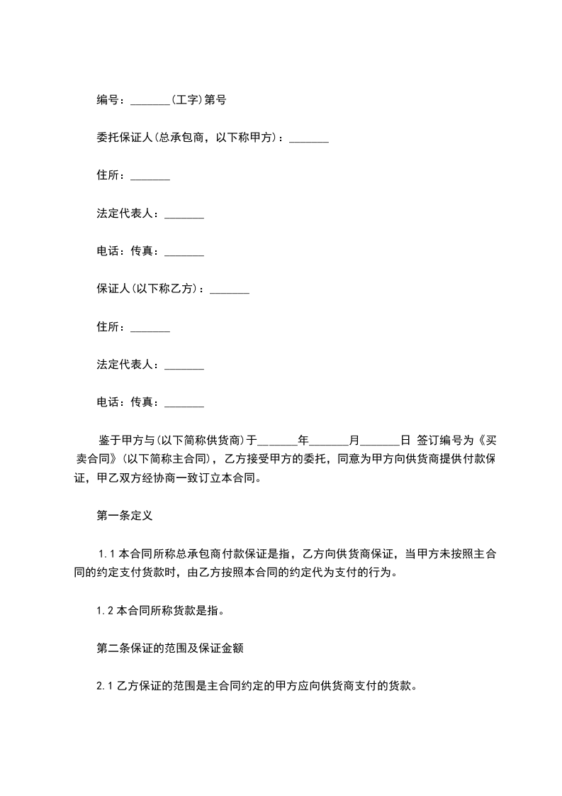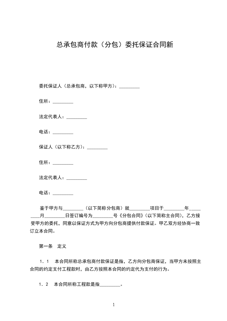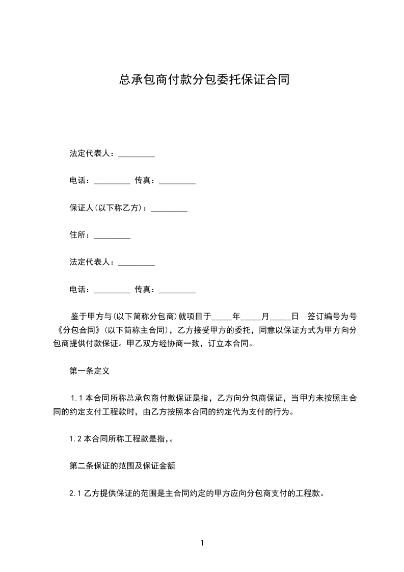 1.1 本合同所称总承包商付款保证是指,乙方向分包商保证,当甲方未按照主合同的约定支付工程款时,由乙方按照本合同的约定代为支付的行为。
