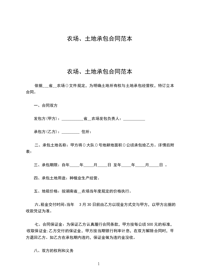 农场、土地承包合同范本