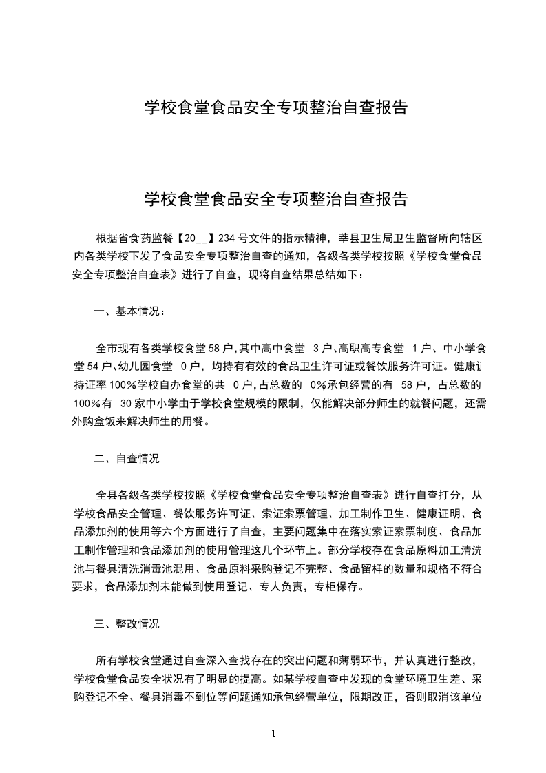 根据省食药监餐【20__】234号文件的指示精神,莘县卫生局卫生监督所向辖区内各类学校下发了食品安全专项整治自查的通知,各级各类学校按照《学校食堂食品安全专项整治自查表》进行了自查,现将自查结果总结如下: