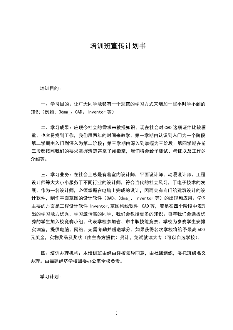 ①教程内容与课时:CAD—16学时,Inventor—16学时,3dma_—16学时。(不知道够不够)②时间场地:每周二、三下午第三节课后