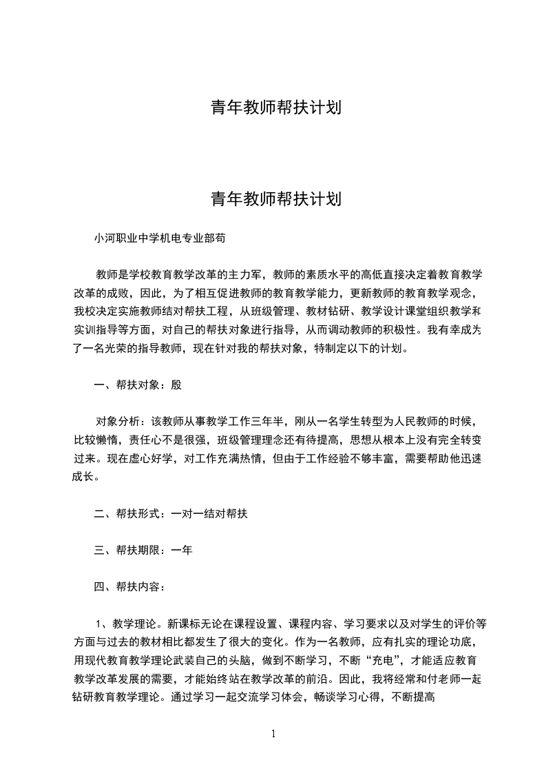 教师是学校教育教学改革的主力军,教师的素质水平的高低直接决定着教育教学改革的成败,因此,为了相互促进教师的教育教学能力,更新教师的教育教学观念,我校决定实施教师结对帮扶工程,从班级管理、教材钻研、教学设计课堂组织教学和实训指导等方面,对自己的帮扶对象进行指导,从而调动教师的积极性。我有幸成为了一名光荣的指导教师,现在针对我的帮扶对象,特制定以下的计划。
