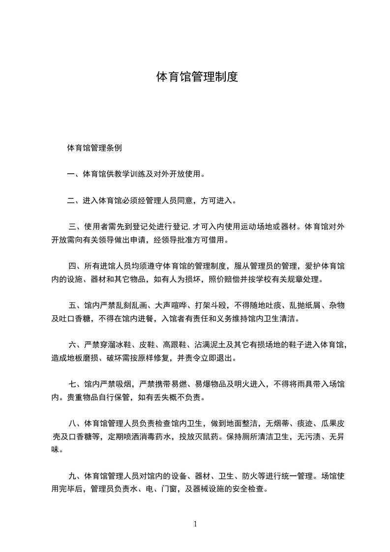 九、体育馆管理人员对馆内的设备、器材、卫生、防火等进行统一管理。场馆使用完毕后,管理员负责水、电、门窗,及器械设施的安全检查。