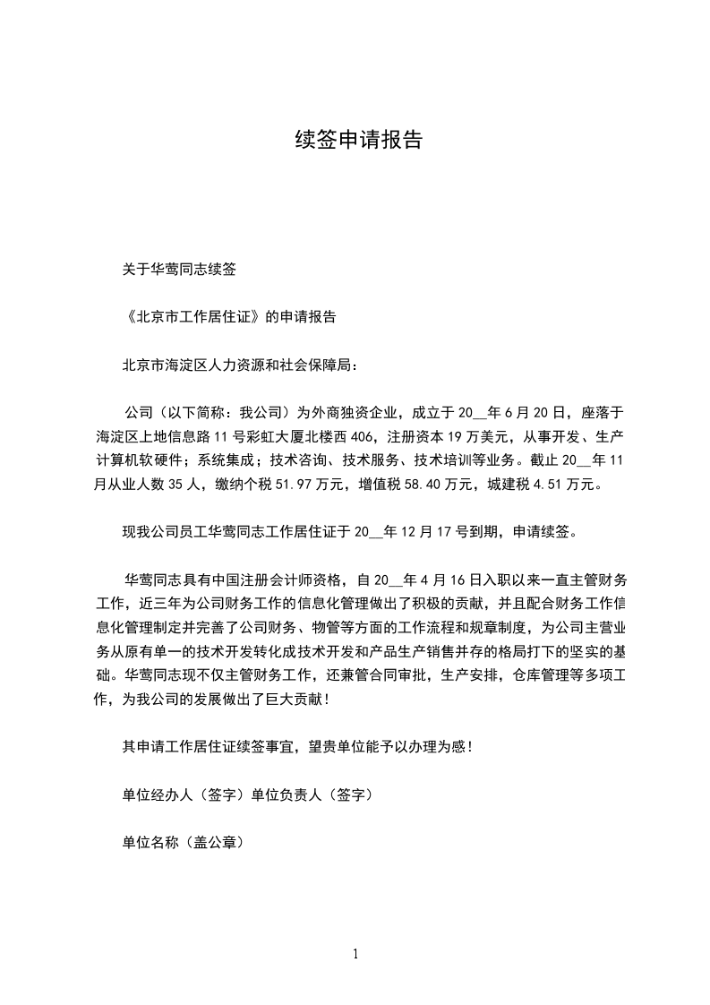 现我公司员工华莺同志工作居住证于20__年12月17号到期,申请续签。