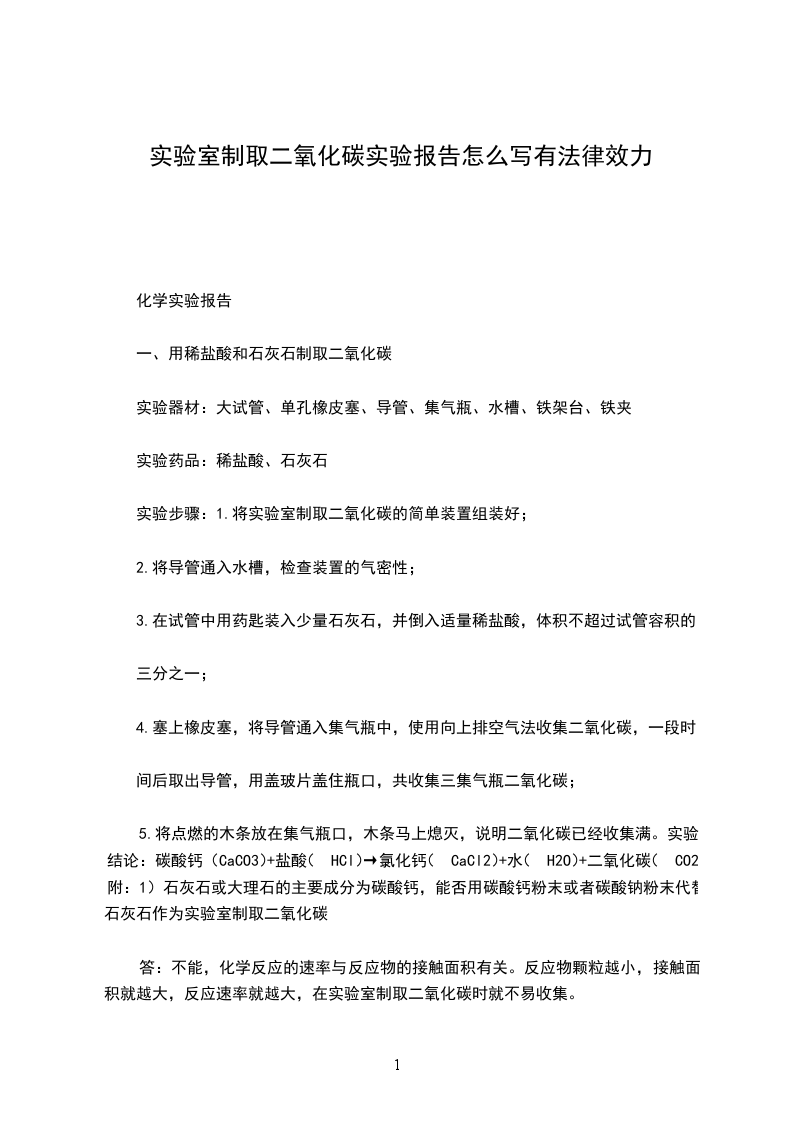 5.将点燃的木条放在集气瓶口,木条马上熄灭,说明二氧化碳已经收集满。实验结论:碳酸钙(CaCO3)+盐酸(HCl)→氯化钙(CaCl2)+水(H2O)+二氧化碳(CO2)附:1)石灰石或大理石的主要成分为碳酸钙,能否用碳酸钙粉末或者碳酸钠粉末代替石灰石作为实验室制取二氧化碳
