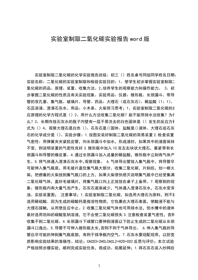 实验药品:收集到的一集气瓶二氧化碳