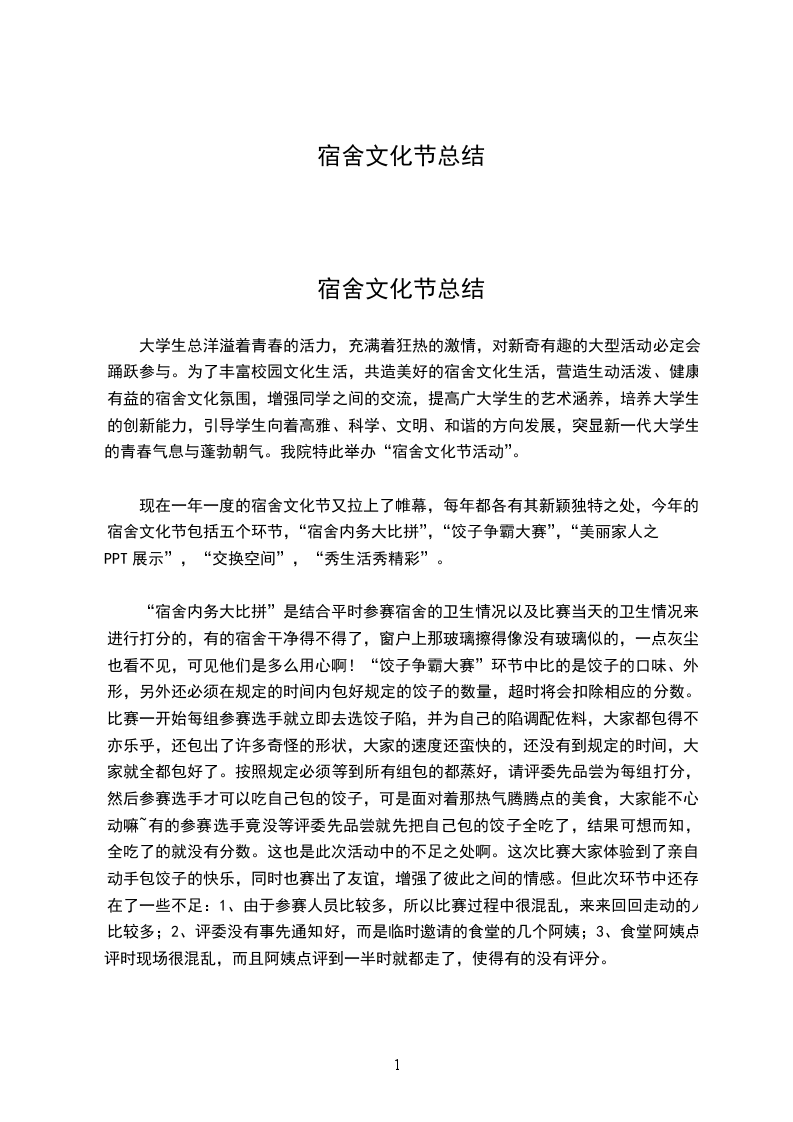 总体来说此次活动还是很成功的,宿舍文化节活动对于进一步树立典型,表彰先进,营造文明、安全、温馨、卫生、舒适的公寓环境,培养大学生良好的生活、卫生习惯,提高学生的综合素质有着显著的作用。本次活动的开展,不但丰富了我院同学们的校园文化品位,丰富了课余生活,进一步美化了我院同学们的生活环境,带给同学们舒畅的心情,从而带动了学习氛围,亦激发了大家的创新