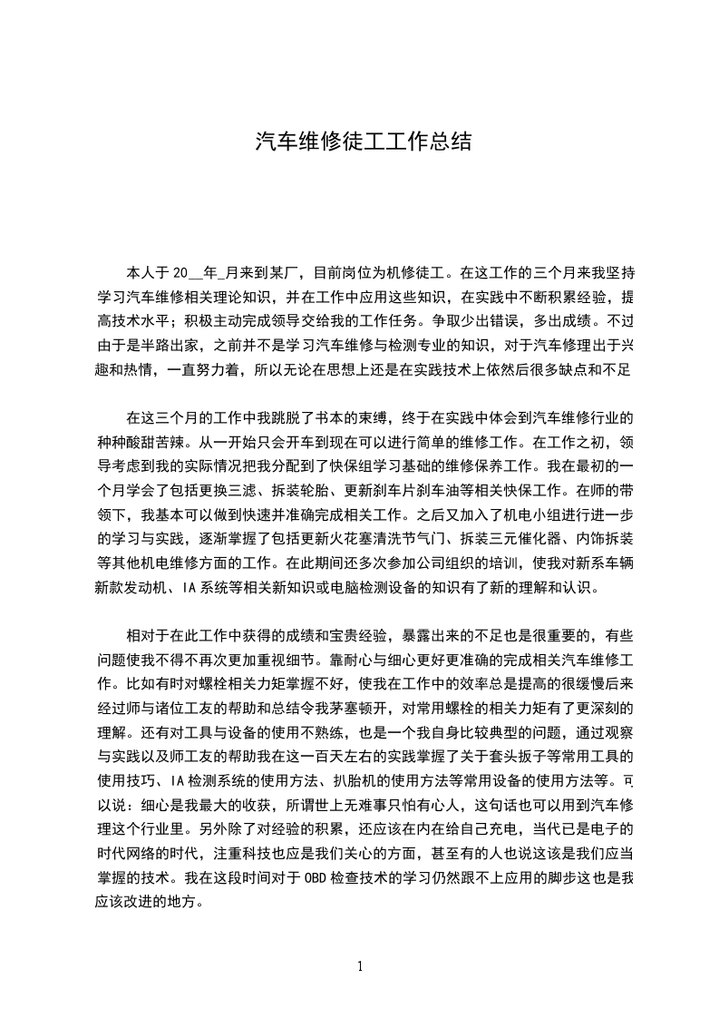 本人于20__年_月来到某厂,目前岗位为机修徒工。在这工作的三个月来我坚持学习汽车维修相关理论知识,并在工作中应用这些知识,在实践中不断积累经验,提高技术水平;积极主动完成领导交给我的工作任务。争取少出错误,多出成绩。不过由于是半路出家,之前并不是学习汽车维修与检测专业的知识,对于汽车修理出于兴趣和热情,一直努力着,所以无论在思想上还是在实践技术上依然后很多缺点和不足。