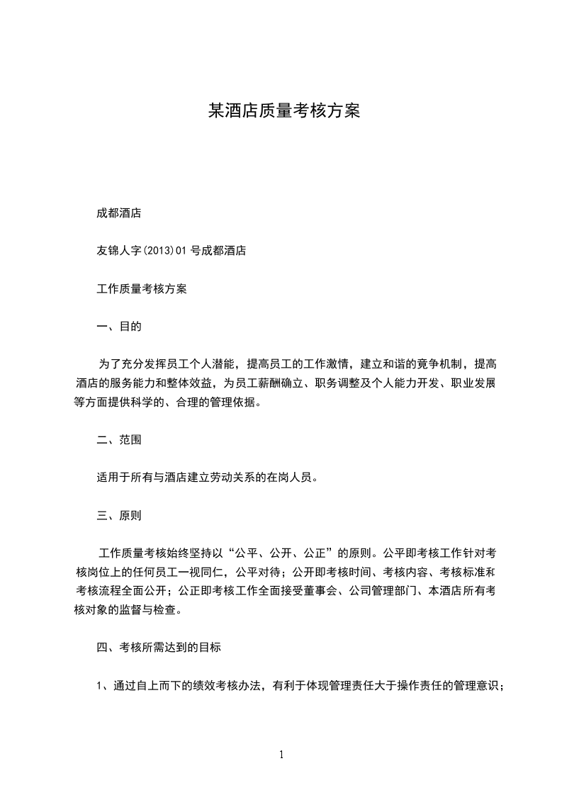 工作质量考核始终坚持以“公平、公开、公正”的原则。公平即考核工作针对考核岗位上的任何员工一视同仁,公平对待;公开即考核时间、考核内容、考核标准和考核流程全面公开;公正即考核工作全面接受董事会、公司管理部门、本酒店所有考核对象的监督与检查。