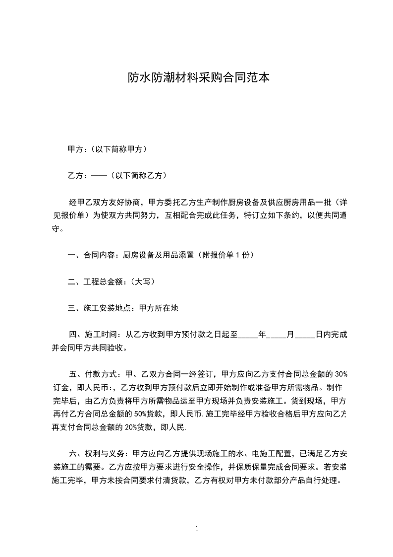 经甲乙双方友好协商,甲方委托乙方生产制作厨房设备及供应厨房用品一批(详见报价单)为使双方共同努力,互相配合完成此任务,特订立如下条约,以便共同遵守。