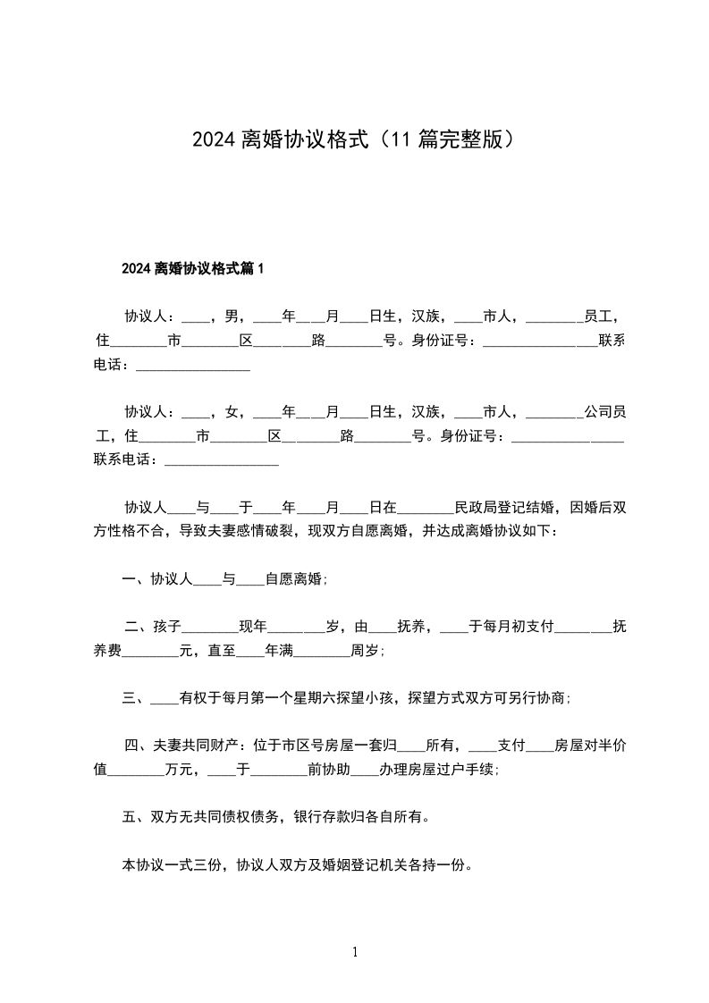 2024离婚协议格式篇1
