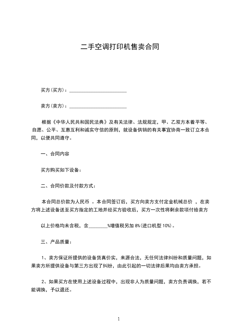 根据《中华人民共和国民法典》及有关法律、法规规定,甲、乙双方本着平等、自愿、公平、互惠互利和诚实守信的原则,就设备供销的有关事宜协商一致订立本合同,以便共同遵守。