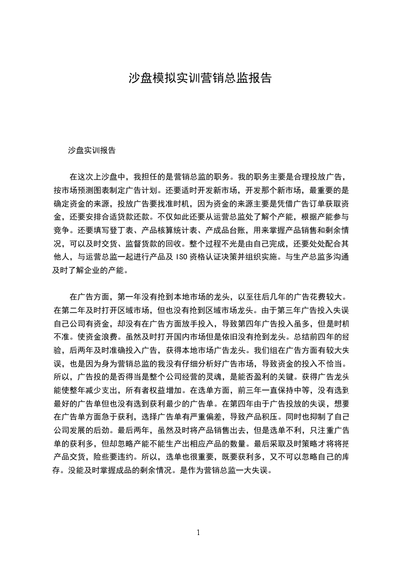 在这次上沙盘中,我担任的是营销总监的职务。我的职务主要是合理投放广告,按市场预测图表制定广告计划。还要适时开发新市场,开发那个新市场,最重要的是确定资金的来源,投放广告要找准时机,因为资金的来源主要是凭借广告订单获取资金,还要安排合适贷款还款。不仅如此还要从运营总监处了解个产能,根据产能参与竞争。还要填写登丁表、产品核算统计表、产成品台账,用来掌握产品销售和剩余情况,可以及时交货、监督货款的回收。整个过程不光是由自己完成,还要处处配合其他人,与运营总监一起进行产品及ISO资格认证决策并组织实施。与生产总监多沟通,及时了解企业的产能。