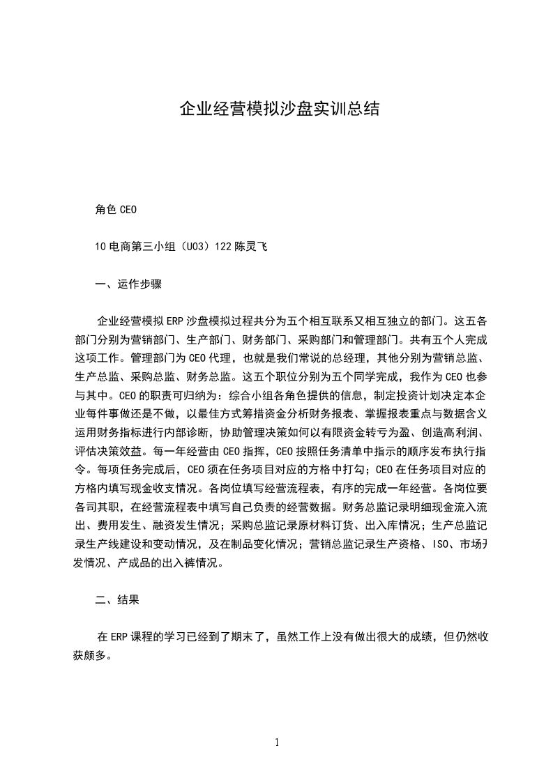 虽然我们小组得到第二。我们既有我们骄傲的地方,也有不足的方面。在营销的方面,以后会注意到广告、选单的问题。如果有继续的发展,我会仔细分析市场,更加准确的研究,希望不要再出现产品积压和产能降低的问题。因为沙盘让我对公司经营有了新的认识,也在其中找到了乐趣。我们要勇于创新。在学习过程中使我们身临其境,体验到经营的风险,让我们学会承担,每一步都体会到精彩也有残酷。在成功和失败中,我们学会如何管理、如何合作、如何提高我们