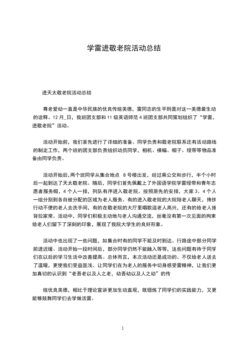 活动中也出现了一些问题,如集合时有的同学不能及时到达、行路途中部分同学前进迟缓、活动开始一段时间后,部分同学仍然不能融入等等,这些问题有待于同学们在以后的学习生活中改善提高。总体而言,本次活动还是成功的。不仅给老人送去了温暖,更使我们受益匪浅。让同学们在为老人的服务中切身感受雷精神,让我们更加真切的认识到“老吾老以及人之老,幼吾幼以及人之幼”的传