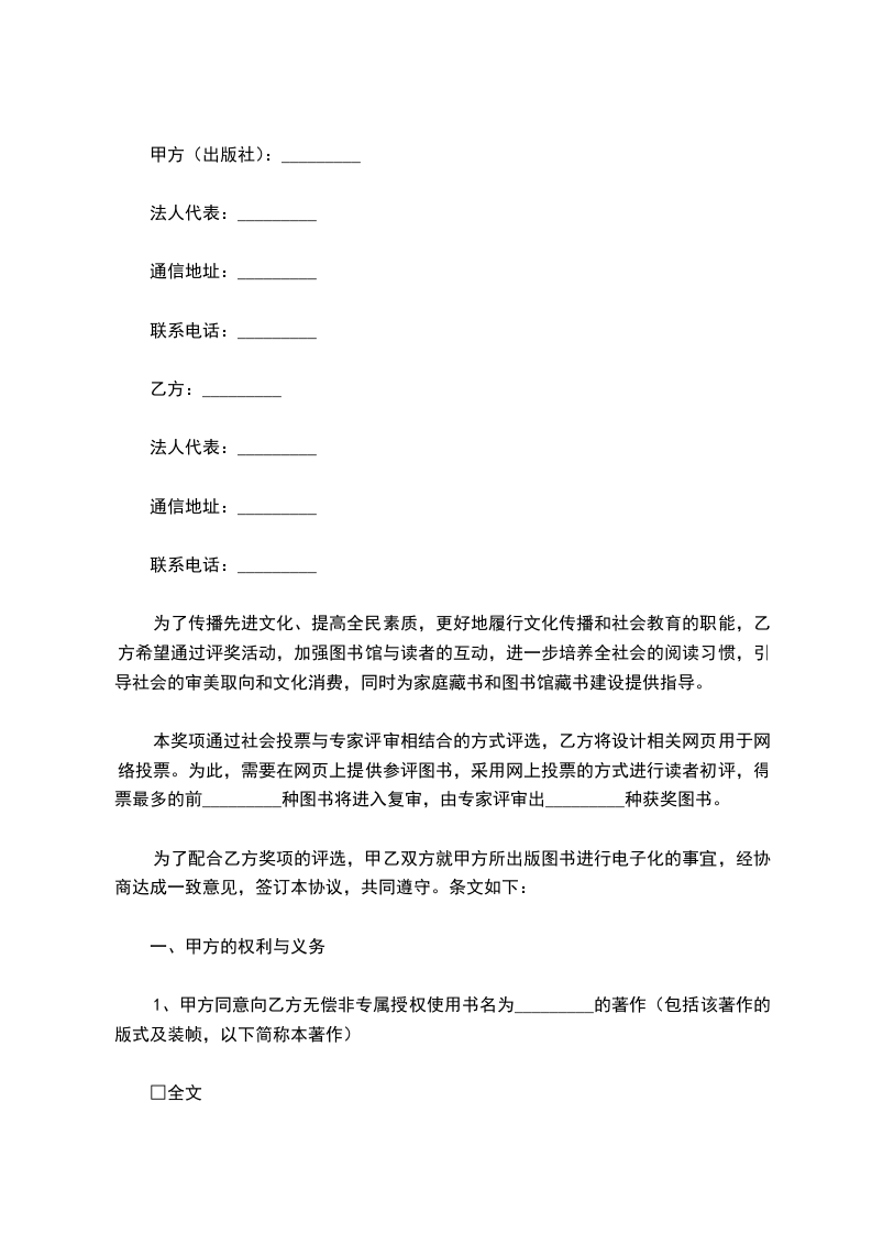 为了配合乙方奖项的评选,甲乙双方就甲方所出版图书进行电子化的事宜,经协商达成一致意见,签订本协议,共同遵守。条文如下: