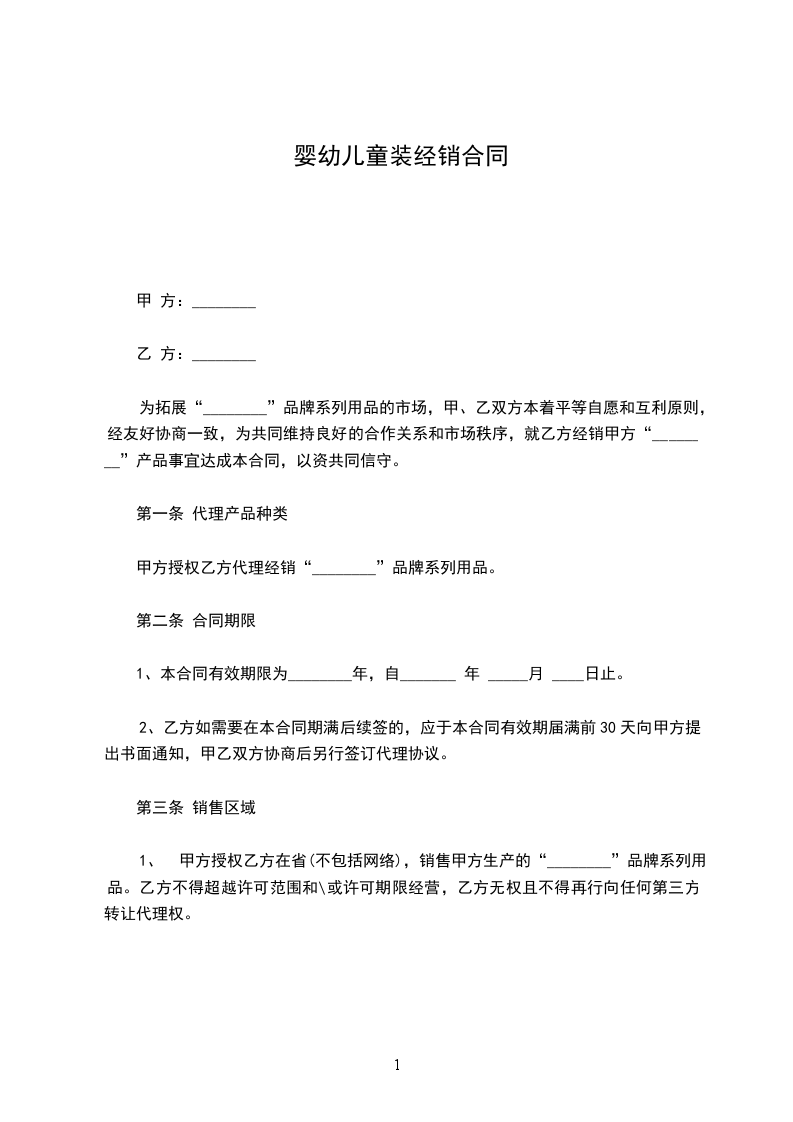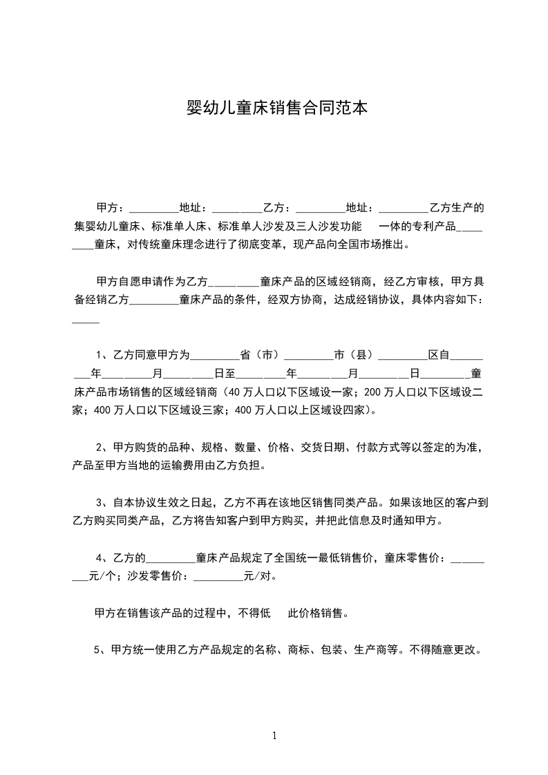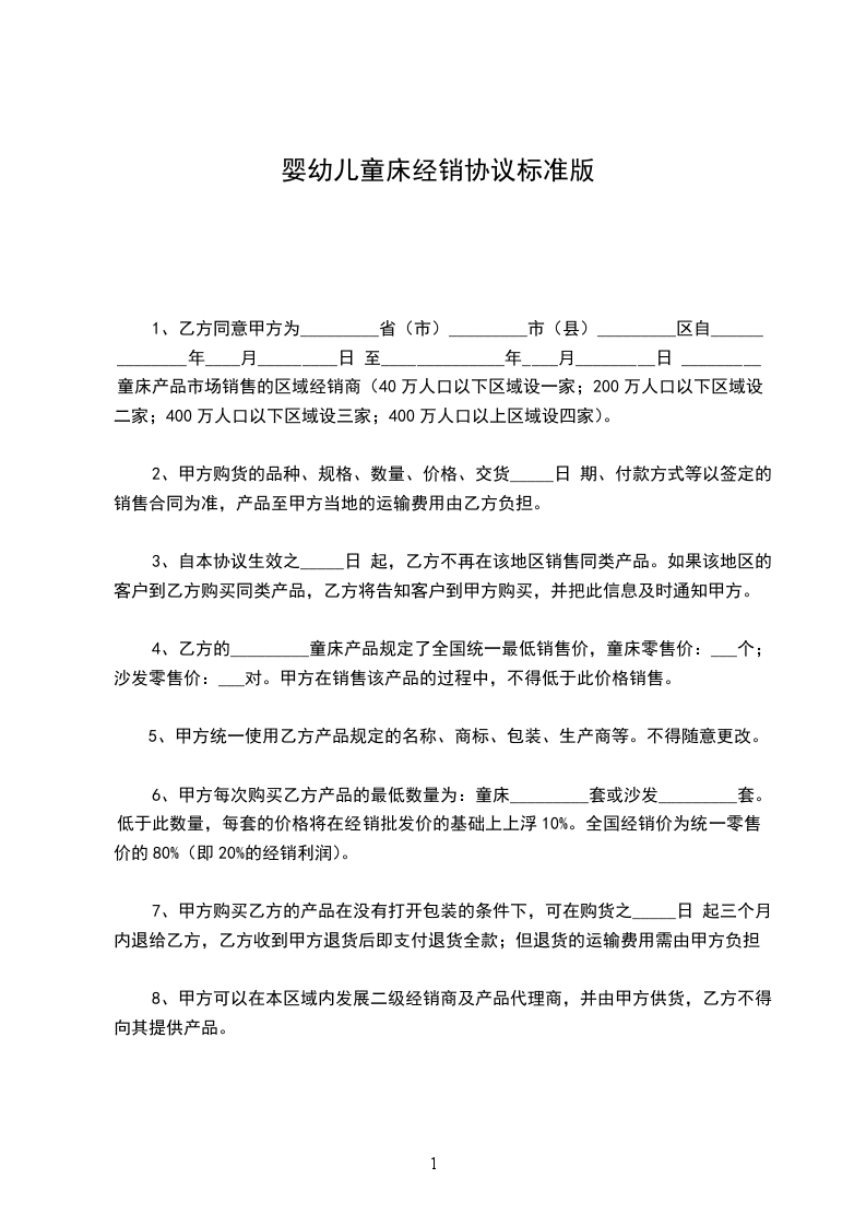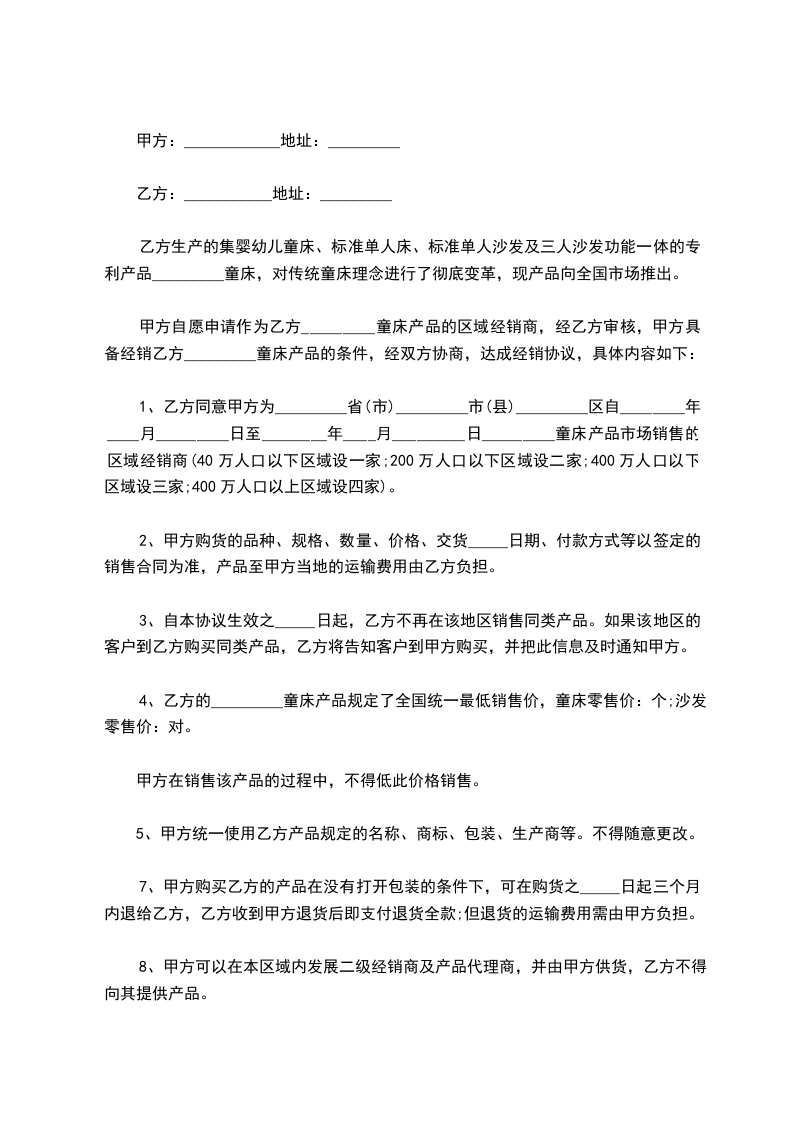 1、乙方同意甲方为_________省(市)_________市(县)_________区自_________年_________月_________日至_________年_________月_________日_________童床产品市场销售的区域经销商(40万人口以下区域设一家;200万人口以下区域设二家;400万人口以下区域设三家;400万人口以上区域设四家)。