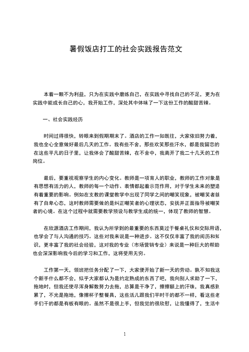 这一次社会实践,让我明白了大学生社会实践是引导我们学生走出校门,走向社会,接触社会,了解社会,投身社会的良好形式;是促使大学生投身改革开放,向工农群众学习,培养锻炼才干得好渠道;是提升思想,修身养性,树立服务社会的思想的有效途径。通过参加社会实践活动,有助于我们在校大学生更新观念,吸收新的思想与知识。这次的社会实践,一晃而过,却让我从中领悟到了很多的东西,而这些东西将让我终生受用。社会实践加深了我与社会各阶层人的感情,拉进了我与社会的距离,也让自己在社会实践中开拓了视野,怎长了才干,进一步明确了自己的奋斗目标。社会是另一个学习和受教育的大课堂,在那片广阔的天地里,既能让我们的人生价值得到体现,更为将来更加激烈的竞争打下更为坚实的基础。陶说过“盛年不再来,一日难再晨,及时宜自勉,岁月不待人。”希望以后还有这样的机会,让我从实践中得到锻炼。