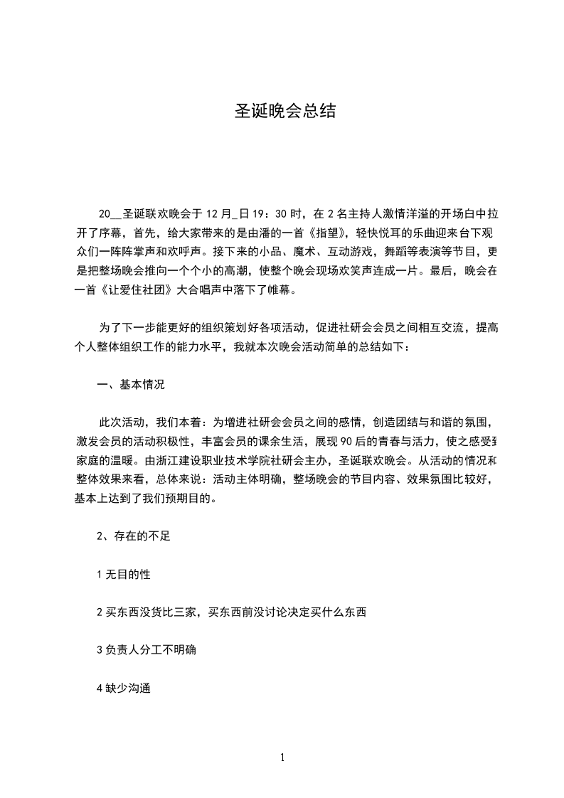20__圣诞联欢晚会于12月_日19:30时,在2名主持人激情洋溢的开场白中拉开了序幕,首先,给大家带来的是由潘的一首《指望》,轻快悦耳的乐曲迎来台下观众们一阵阵掌声和欢呼声。接下来的小品、魔术、互动游戏,舞蹈等表演等节目,更是把整场晚会推向一个个小的高潮,使整个晚会现场欢笑声连成一片。最后,晚会在一首《让爱住社团》大合唱声中落下了帷幕。