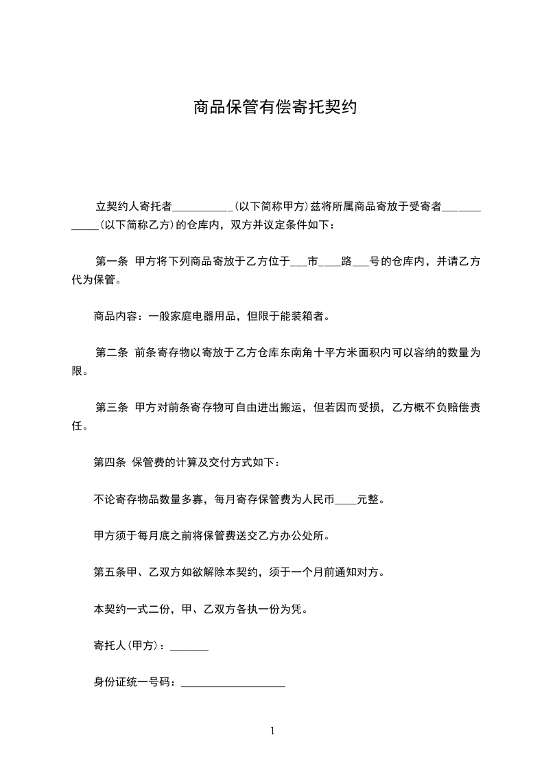 第一条 甲方将下列商品寄放于乙方位于_________市_________路_________号的仓库内,并请乙方代为保管。