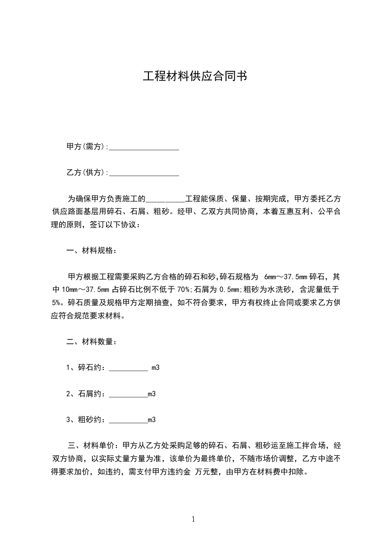 三、材料单价:甲方从乙方处采购足够的碎石、石屑、粗砂运至施工拌合场,经双方协商,以实际丈量方量为准,该单价为最终单价,不随市场价调整,乙方中途不得要求加价,如违约,需支付甲方违约金 万元整,由甲方在材料费中扣除。