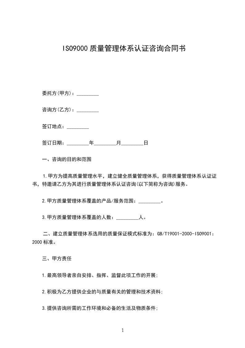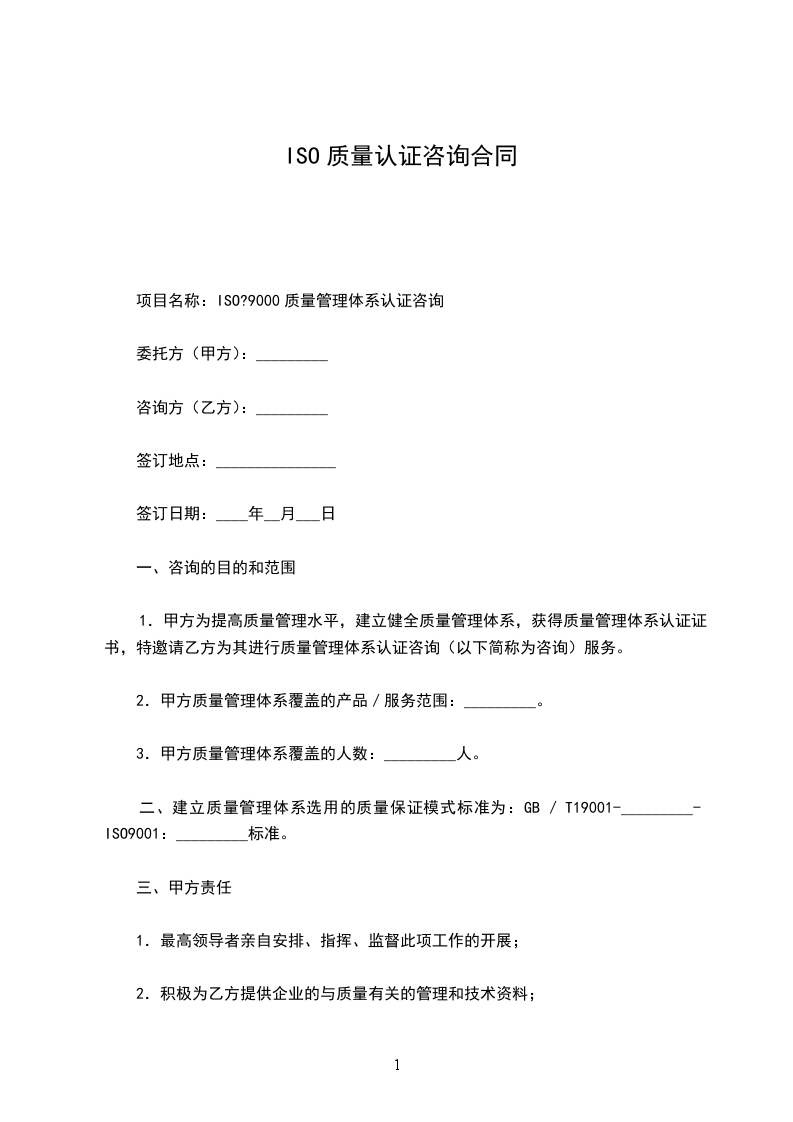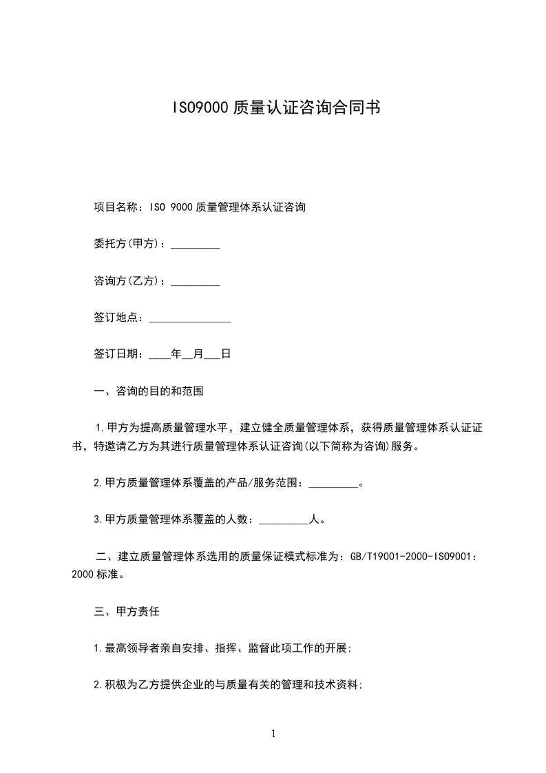 1.甲方为提高质量管理水平,建立健全质量管理体系,获得质量管理体系认证证书,特邀请乙方为其进行质量管理体系认证咨询(以下简称为咨询)服务。
