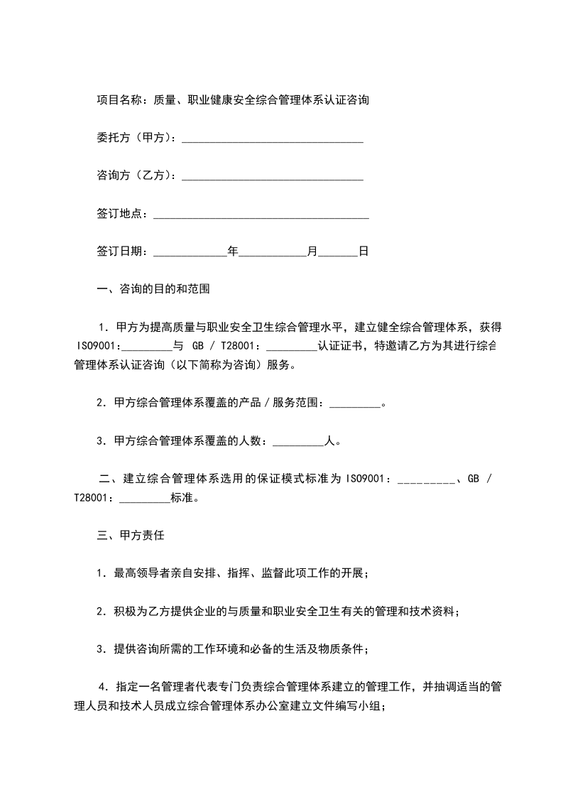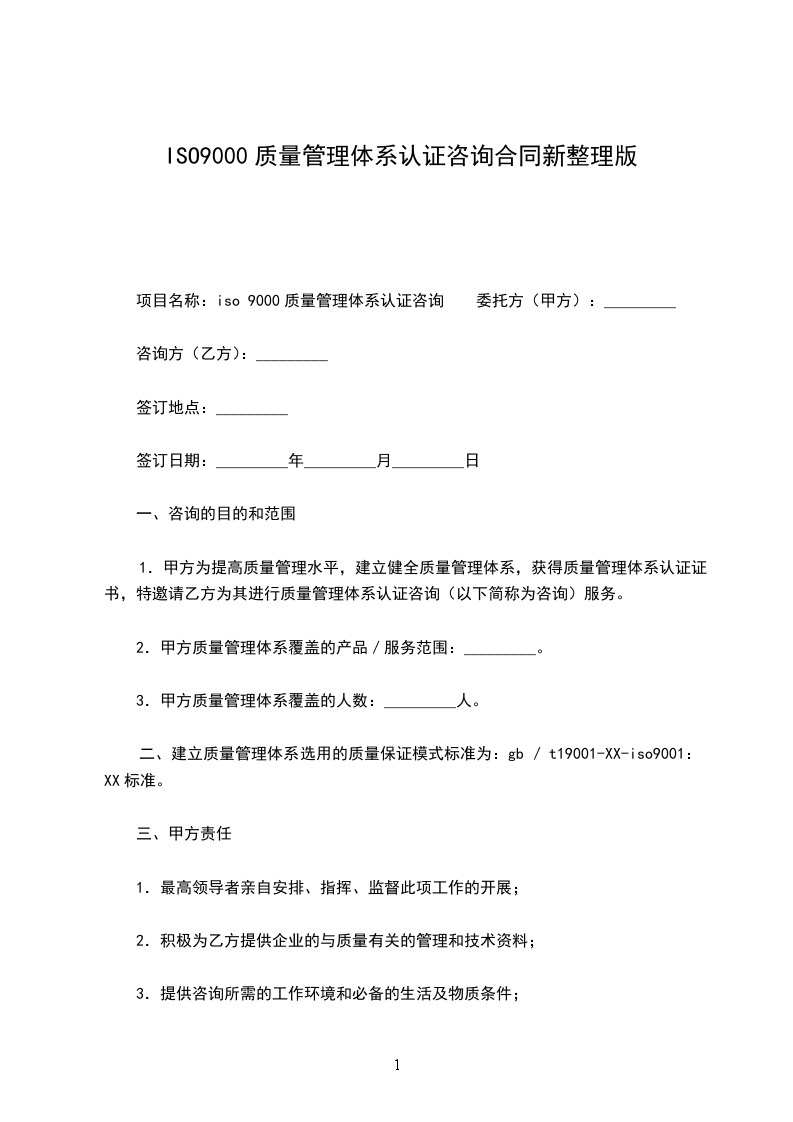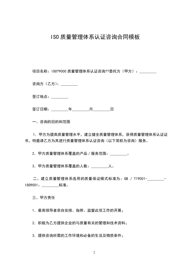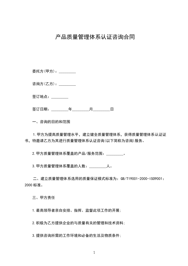 1.甲方为提高质量管理水平,建立健全质量管理体系,获得质量管理体系认证证书,特邀请乙方为其进行质量管理体系认证咨询(以下简称为咨询)服务。