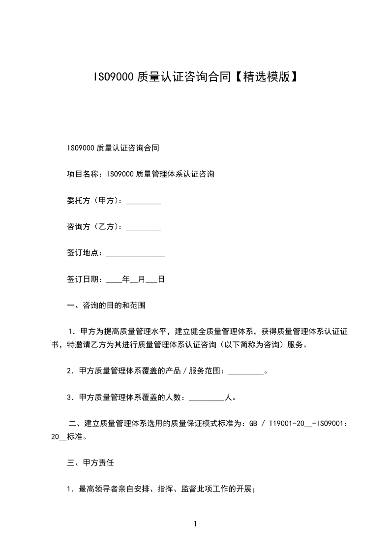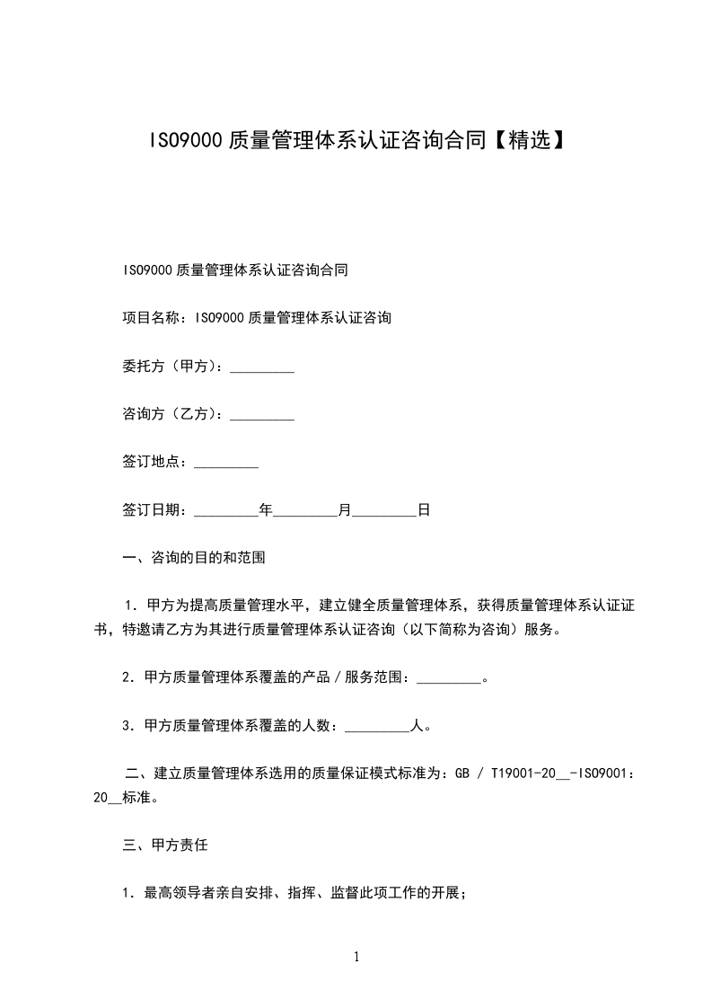 1.履行期限:_________年_________月_________日至甲方通过质量管理体系认证时结束。