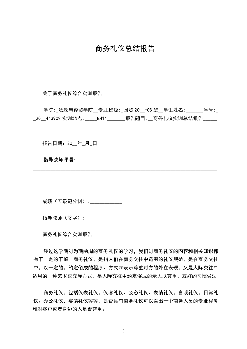 学院:_法政与经贸学院__专业班级:_国贸20__-03班__学生姓名:_______学号:__20__443909实训地点:_____E411_______报告题目:__商务礼仪实训总结报告________