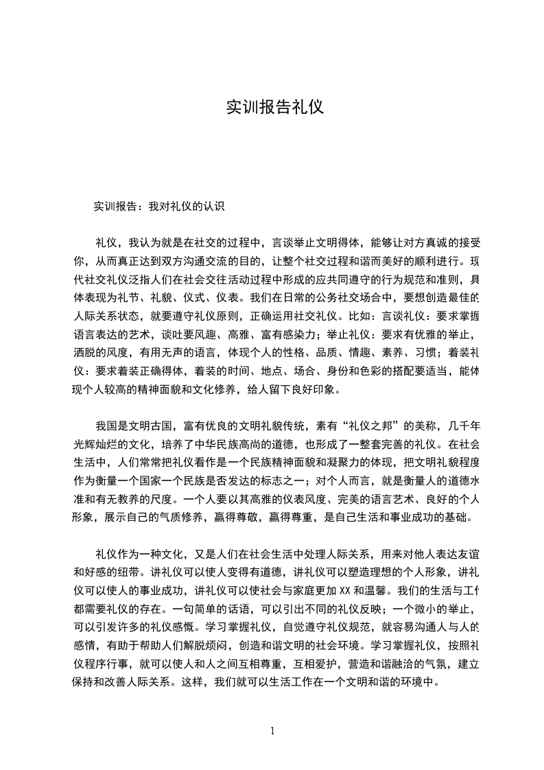 为期两周的商务礼仪实训已然结束,我们通过这次实训学习到了大量的商务礼仪相关知识,这对我养成正确的礼仪习惯有很大的帮助,在以后的职场当中,作为一个商务人员,应该具有在各种场合下的商务礼仪知识,才能不犯有违礼仪的错误,避免给客户、老板、或者同事留下不好的印象,而这次实训使我们相关方面的知识得到增加,从而具备把握好商务场合下各种细节的能力,为将来我们的职业生涯打下了坚实的基础。
