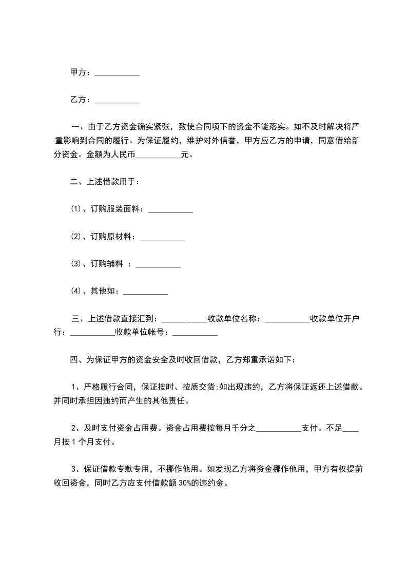 一、甲方因经营活动需要,向乙方借款人民币__________万元(____________),乙方于________年____月____日之前将该笔款项汇入甲方或者其指定账户,由甲方向乙方出具收到借款的确认书。